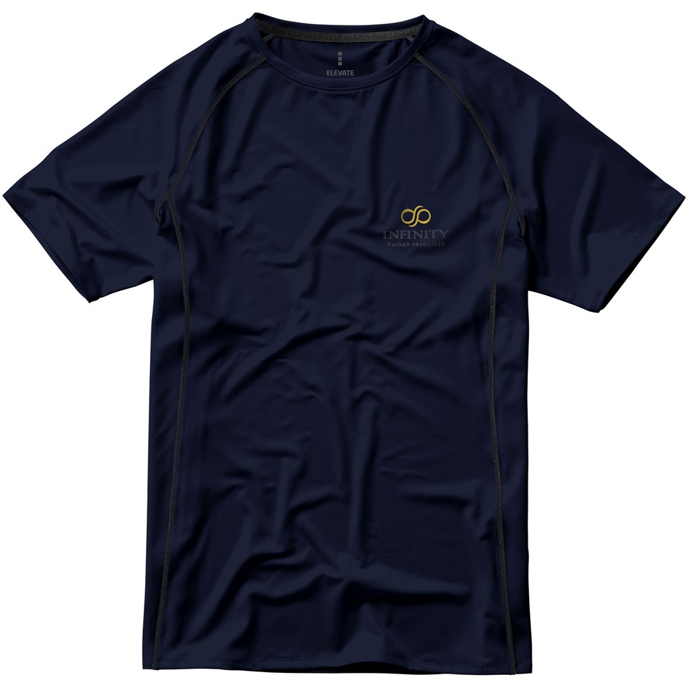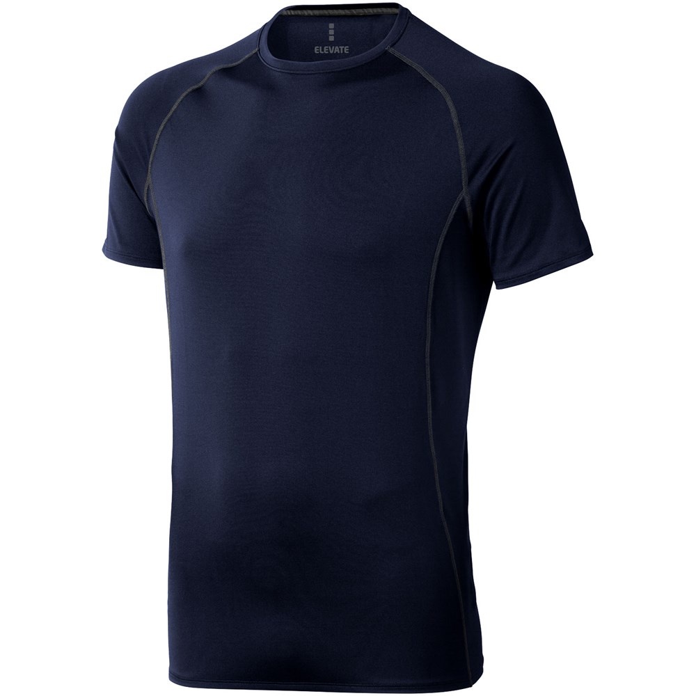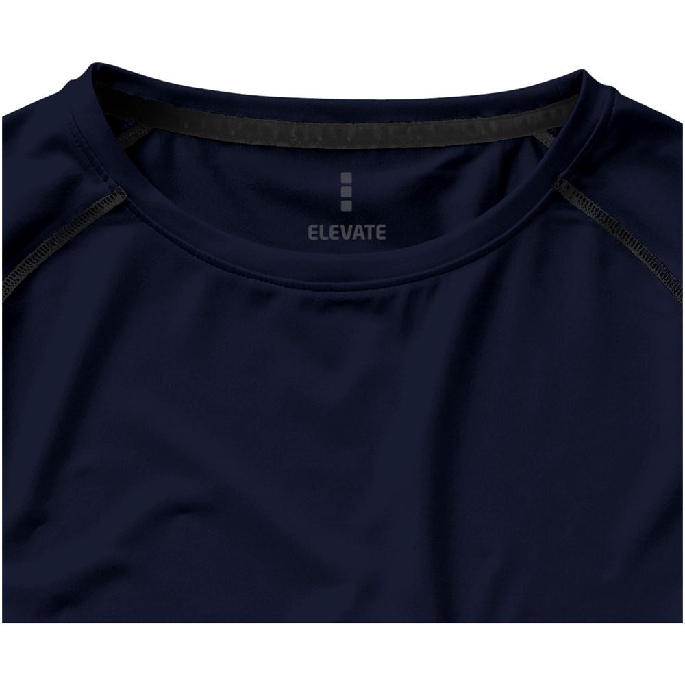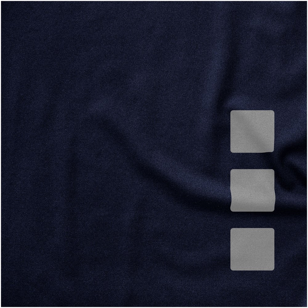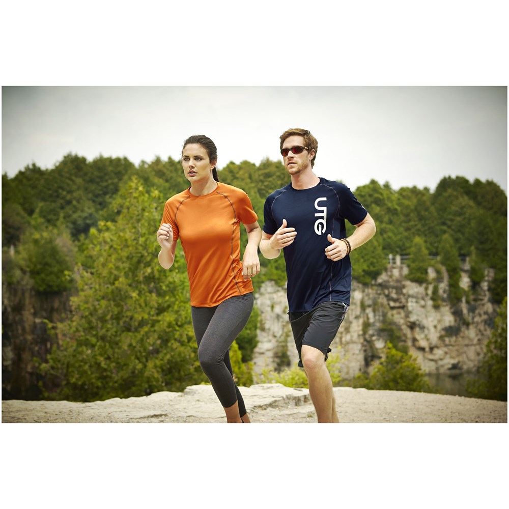 Stoff Einfassung am Kragen. Rundhalsausschnitt. Raglan Ärmel. Stetch-Material. Dünne Flatlock-Naht Details. Satin Nackenband. Doppelnaht an Kragen und Saum. Reflektierende Details. Transfer Hauptlabel für den etikettfreien Komfort..