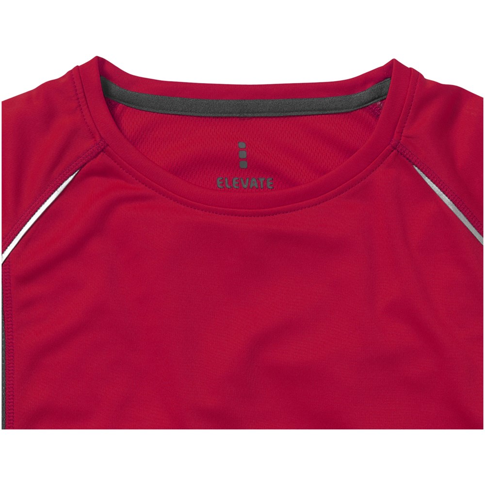 Stoff Einfassung am Kragen. Rundhalsausschnitt. Seiteneinsätze aus Netzmaterial. Reflektierende Details. Raglan Ärmel. Transfer Hauptlabel für den etikettfreien Komfort. Dünne Flatlock-Naht Details. Satin Nackenband.
