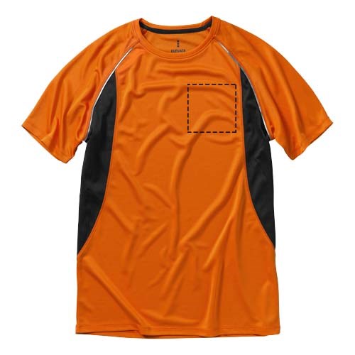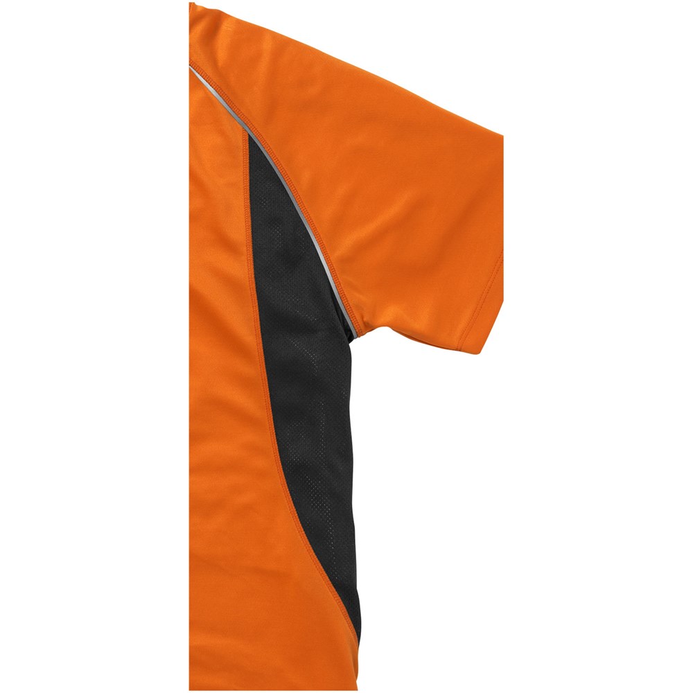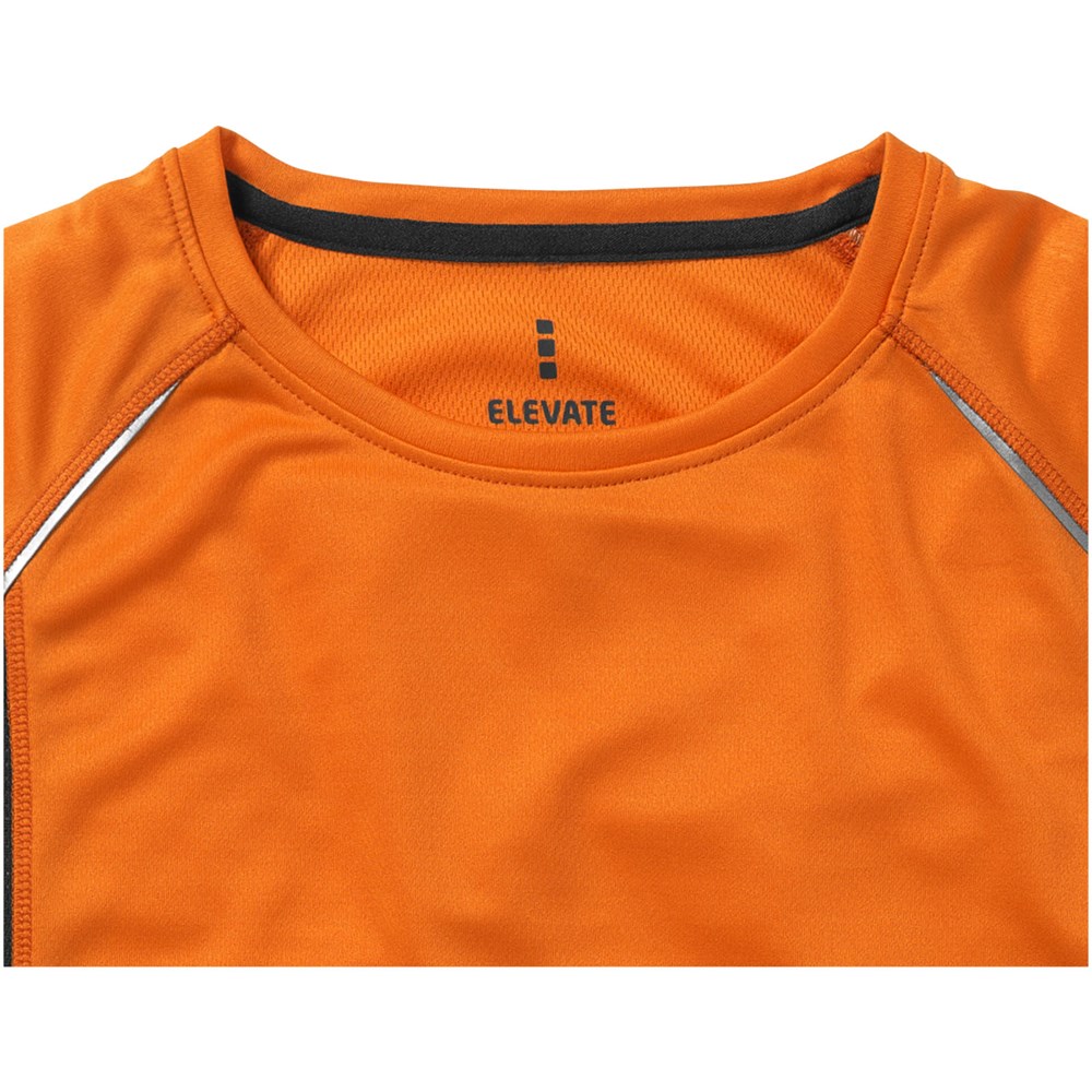 Stoff Einfassung am Kragen. Rundhalsausschnitt. Seiteneinsätze aus Netzmaterial. Reflektierende Details. Raglan Ärmel. Transfer Hauptlabel für den etikettfreien Komfort. Dünne Flatlock-Naht Details. Satin Nackenband.