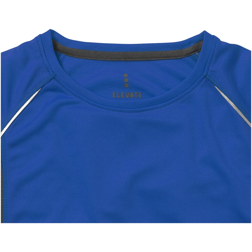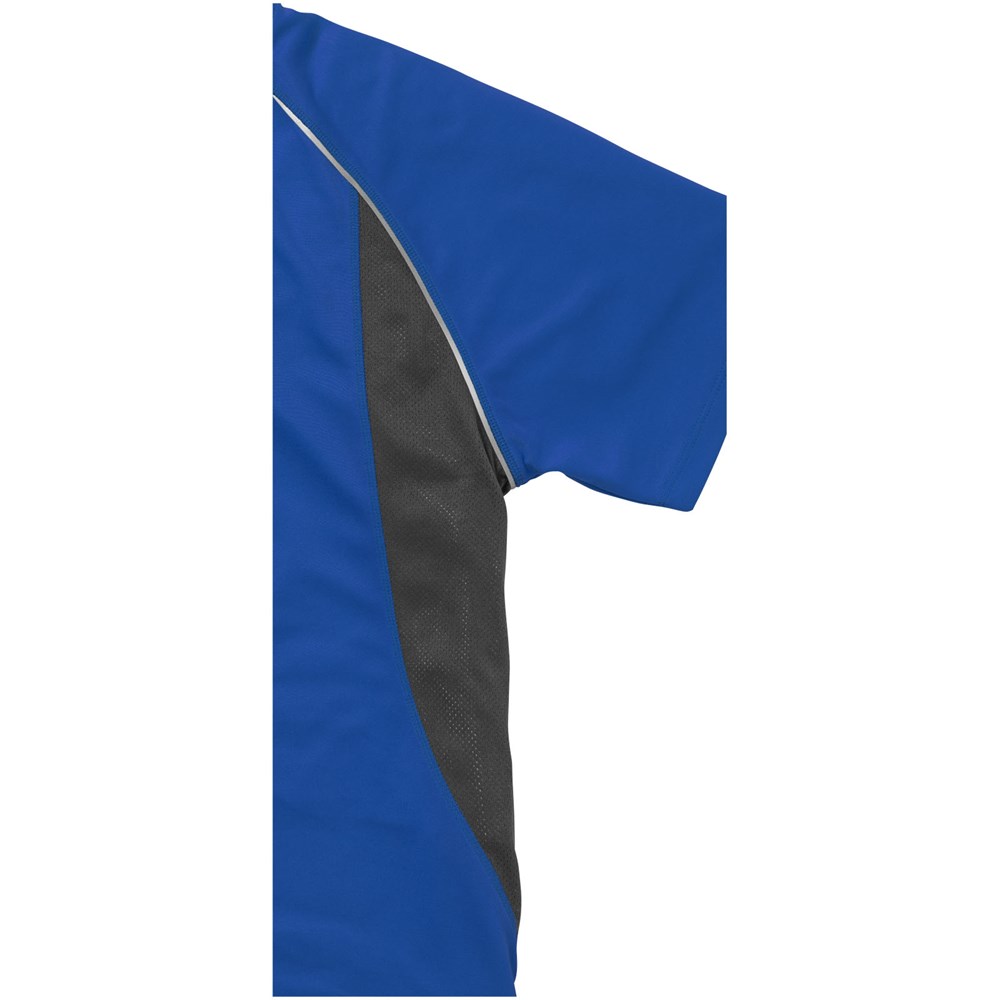 Stoff Einfassung am Kragen. Rundhalsausschnitt. Seiteneinsätze aus Netzmaterial. Reflektierende Details. Raglan Ärmel. Transfer Hauptlabel für den etikettfreien Komfort. Dünne Flatlock-Naht Details. Satin Nackenband.
