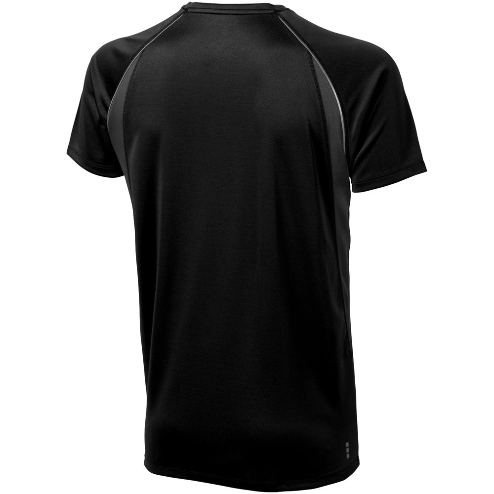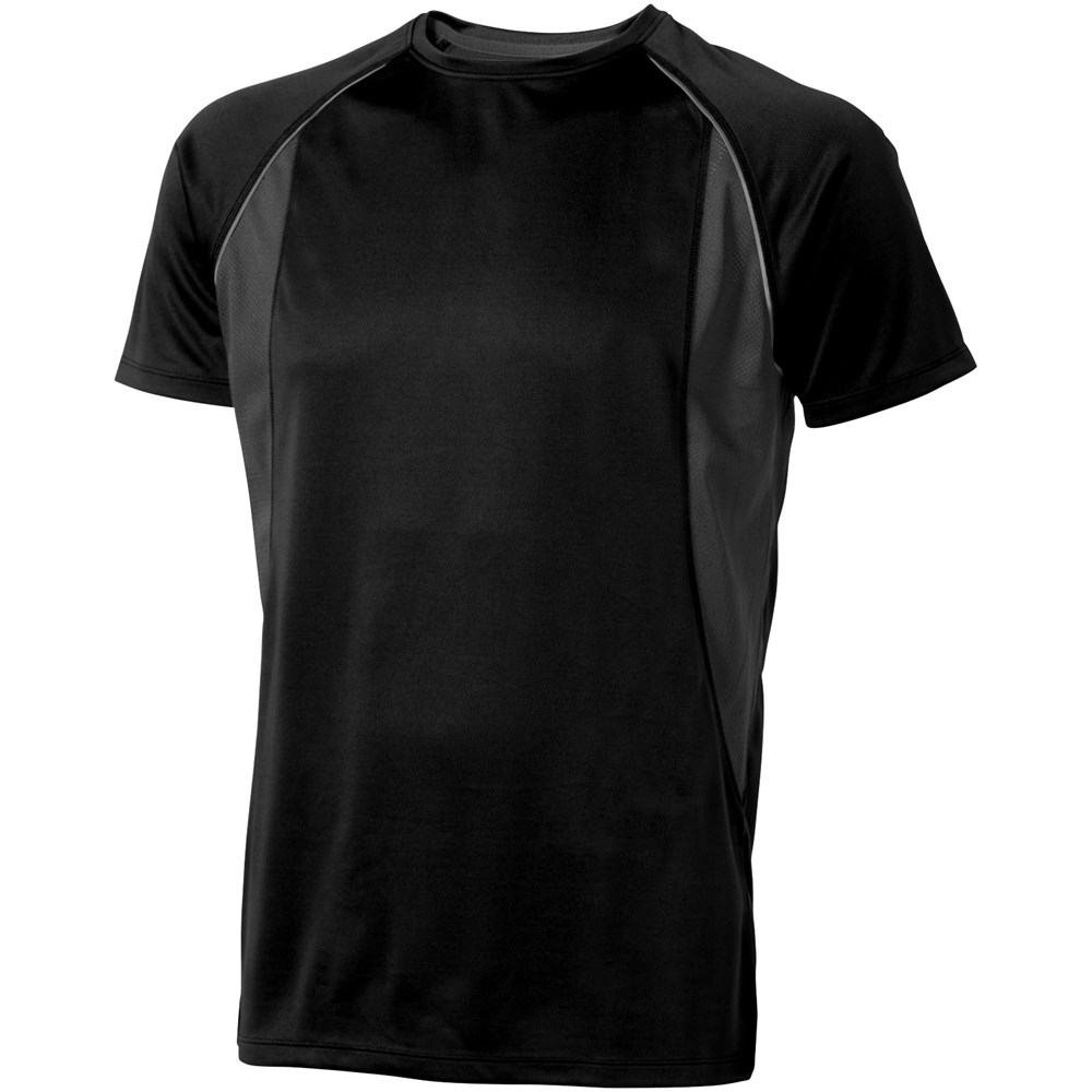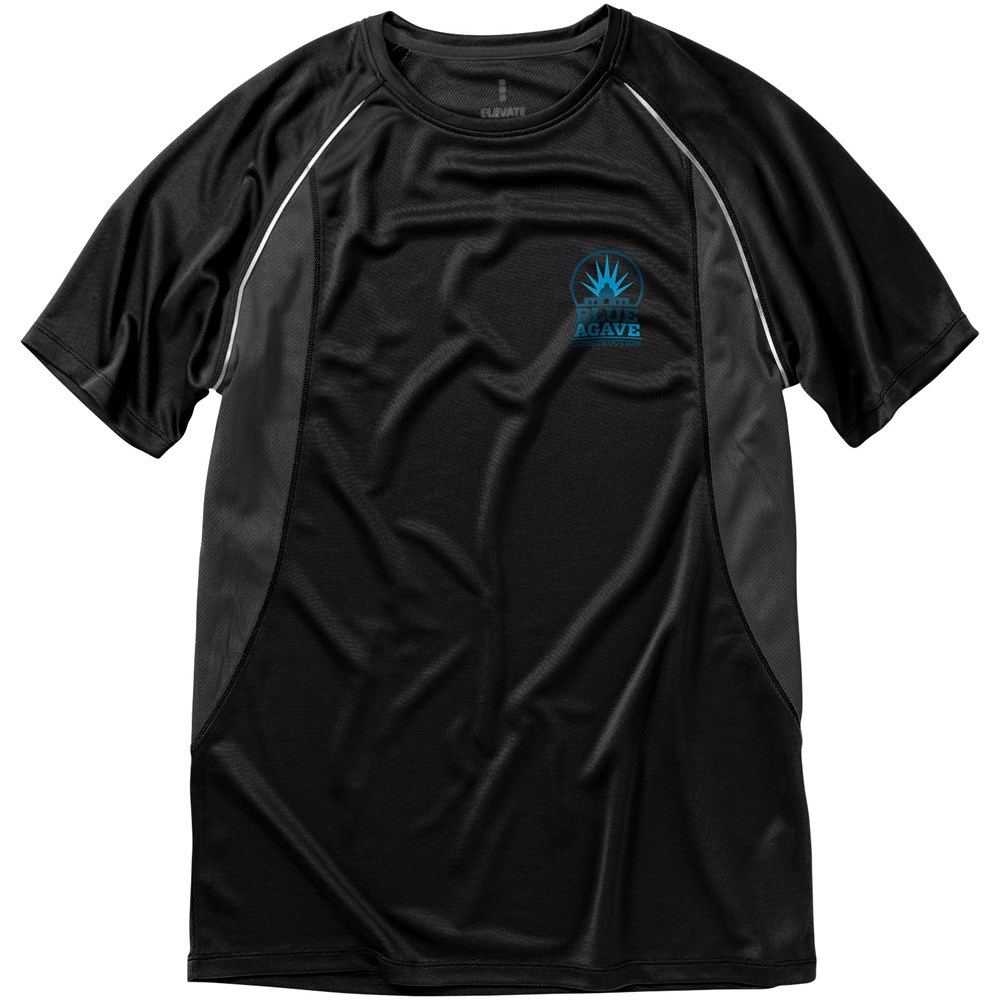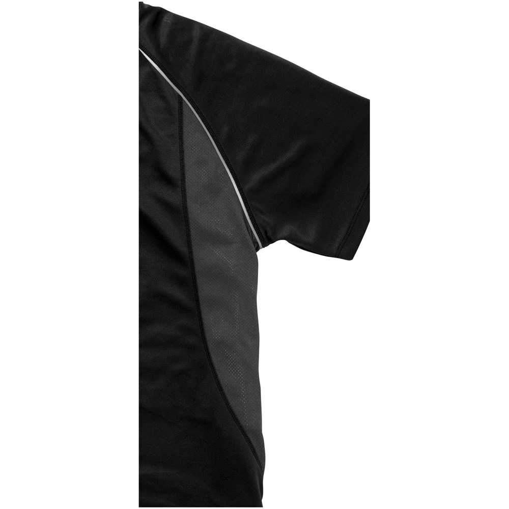 Stoff Einfassung am Kragen. Rundhalsausschnitt. Seiteneinsätze aus Netzmaterial. Reflektierende Details. Raglan Ärmel. Transfer Hauptlabel für den etikettfreien Komfort. Dünne Flatlock-Naht Details. Satin Nackenband.