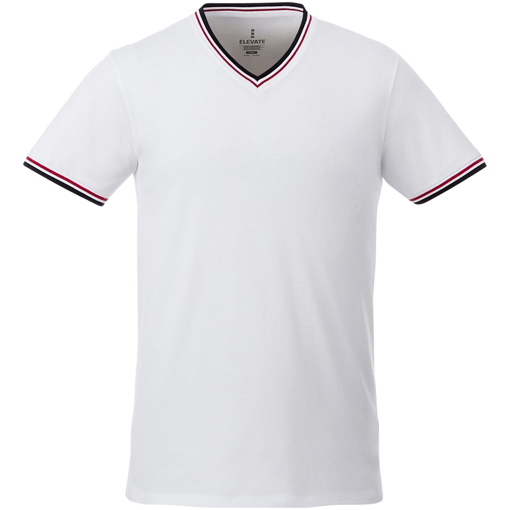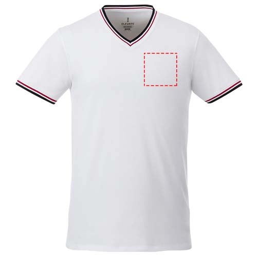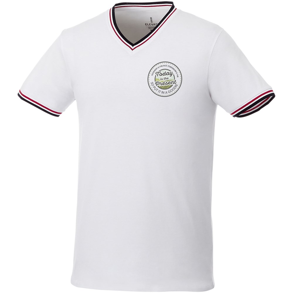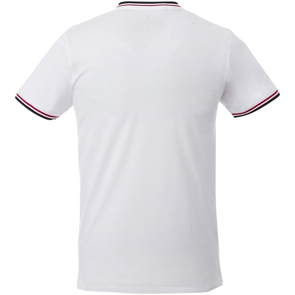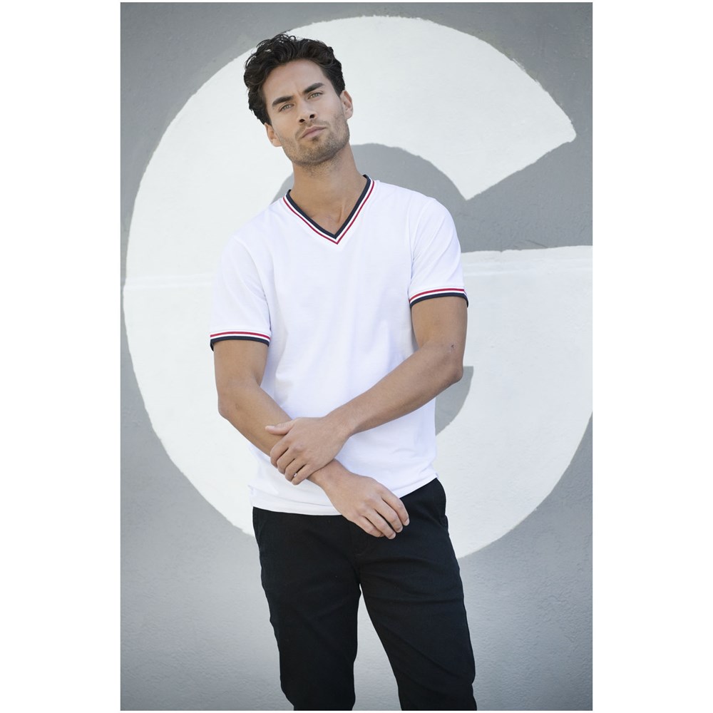 Flachstrickkragen. 1x1 Rippstrickkragen und Bund. Kontrastfarbige Streifen an Kragen und Ärmeln. V-Ausschnitt. Doppelnaht an Kragen und Saum. Transfer Hauptlabel für den etikettfreien Komfort.