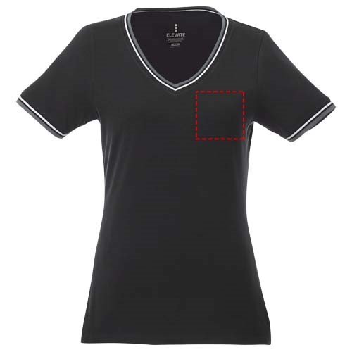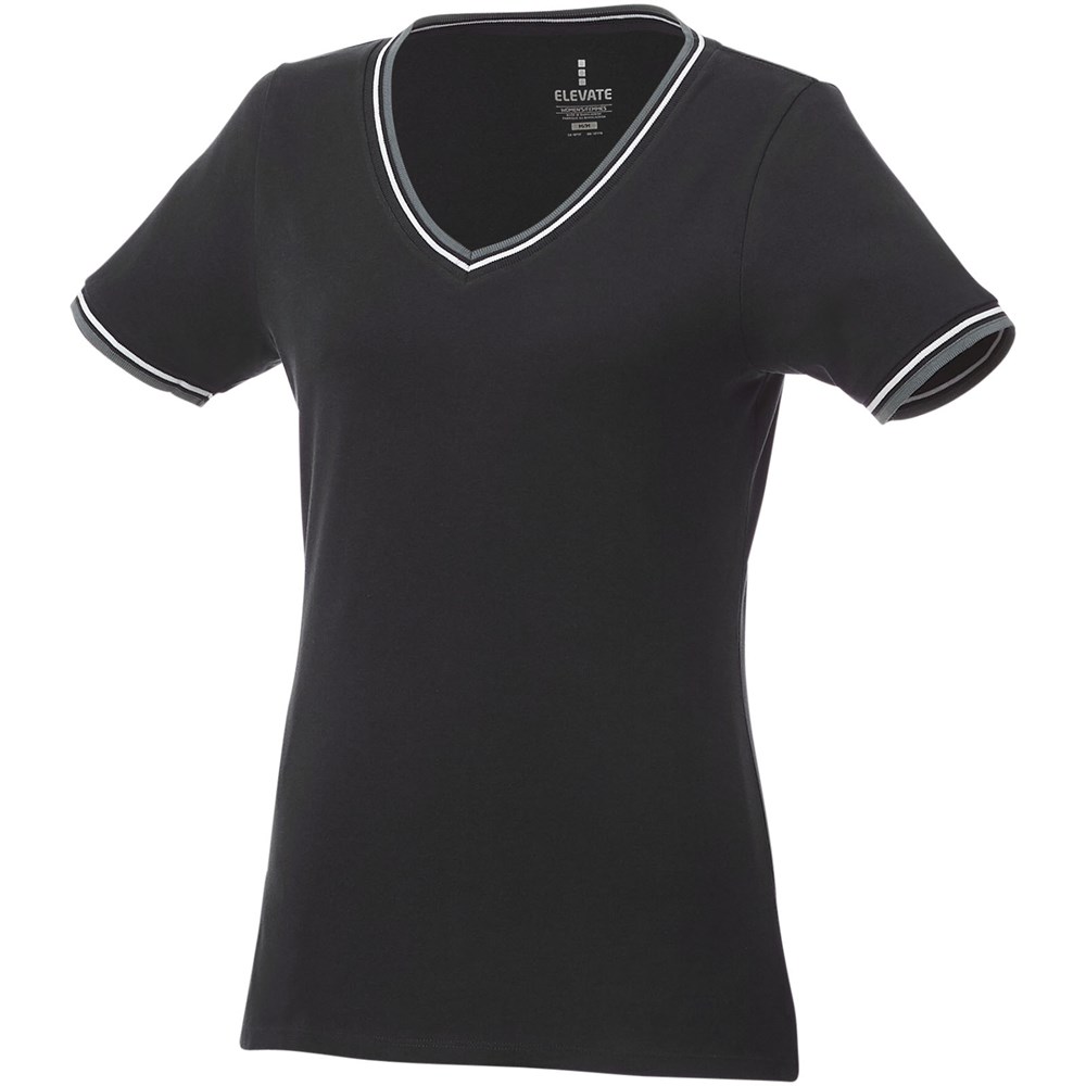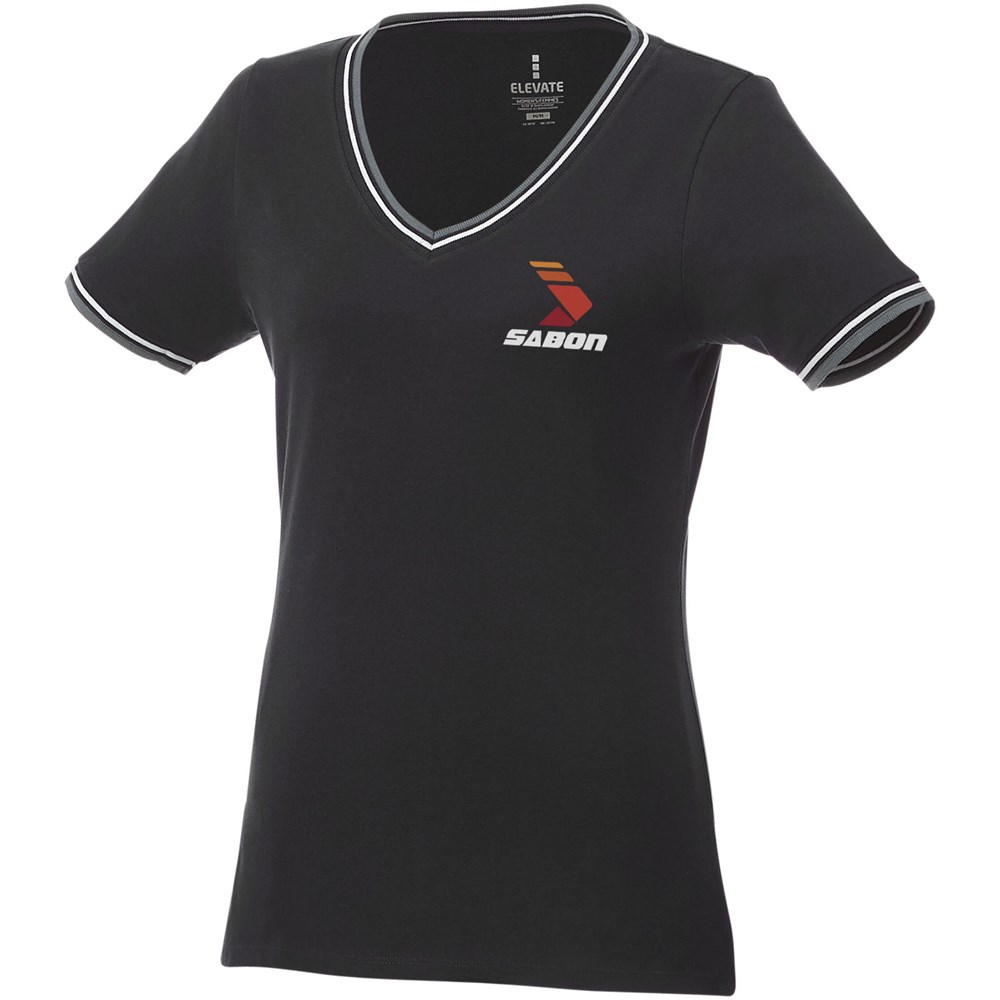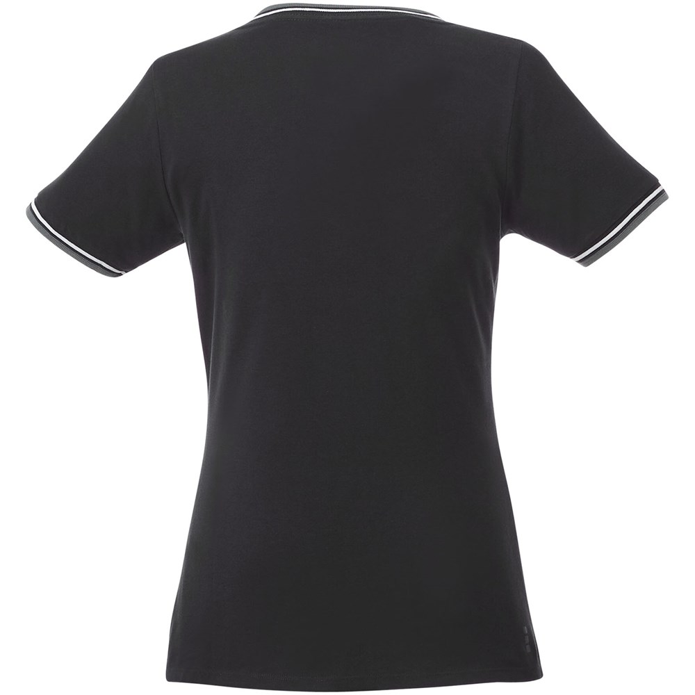Flachstrickkragen. 1x1 Rippstrickkragen und Bund. Kontrastfarbige Streifen an Kragen und Ärmeln. V-Ausschnitt. Doppelnaht an Kragen und Saum. Transfer Hauptlabel für den etikettfreien Komfort.