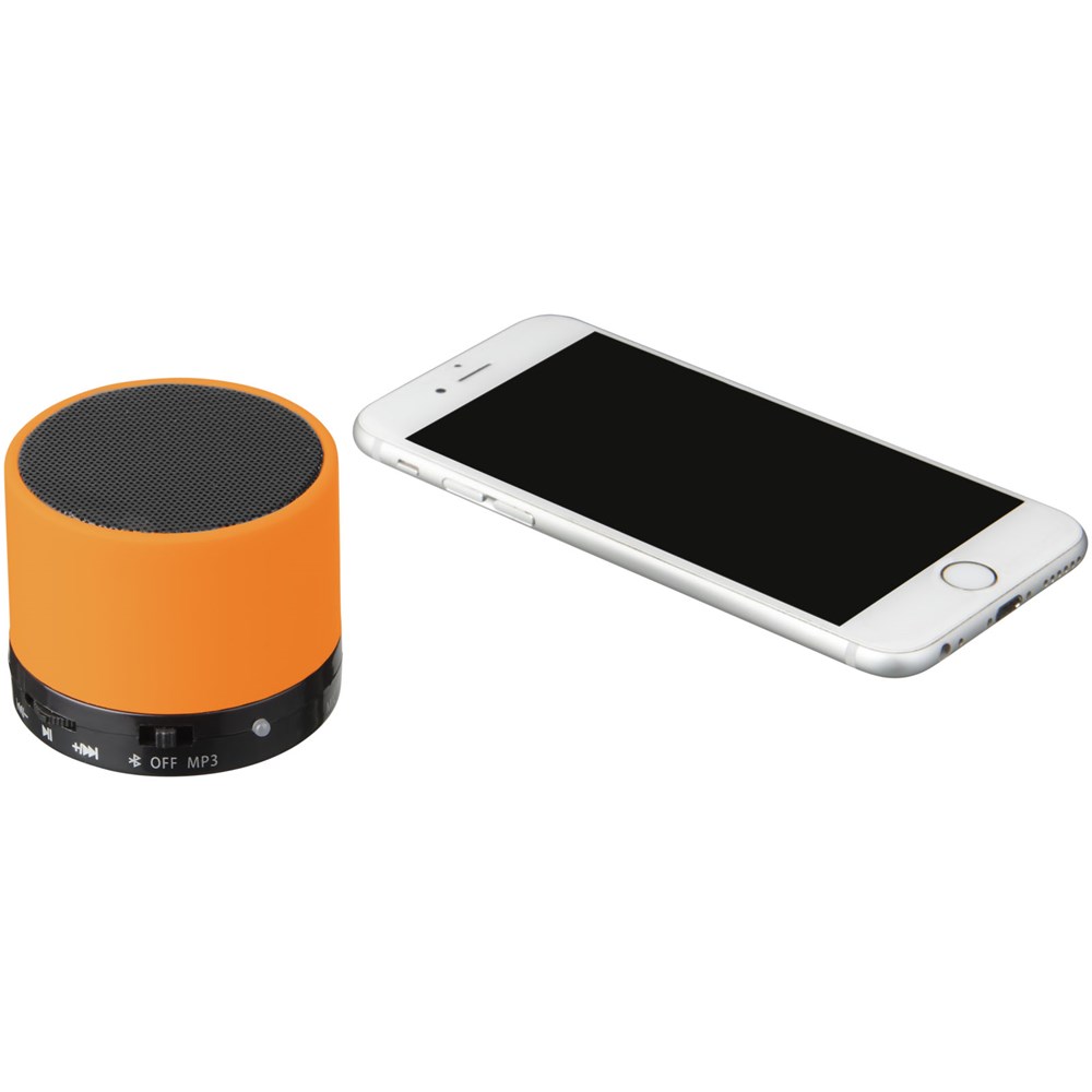 Gummizylinder-Lautsprecher. Genießen Sie Musik und Filme überall, indem Sie Ihr Bluetooth®-kompatibles Gerät wie iPhone, iPad oder Android-OS-Geräte mit diesem tragbaren Bluetooth®-Lautsprecher (10 m Reichweite) verbinden. Der Lautsprecher erlaubt Ihnen mit dem eingebauten Mikrofon eine Telefonkonferenz unterwegs über Ihr Smartphone oder per Video-Chat-Programme wie Skype, zu halten. Kommt in einer schönen gummierten Ausführung. Ein USB-Netzteil ist enthalten.