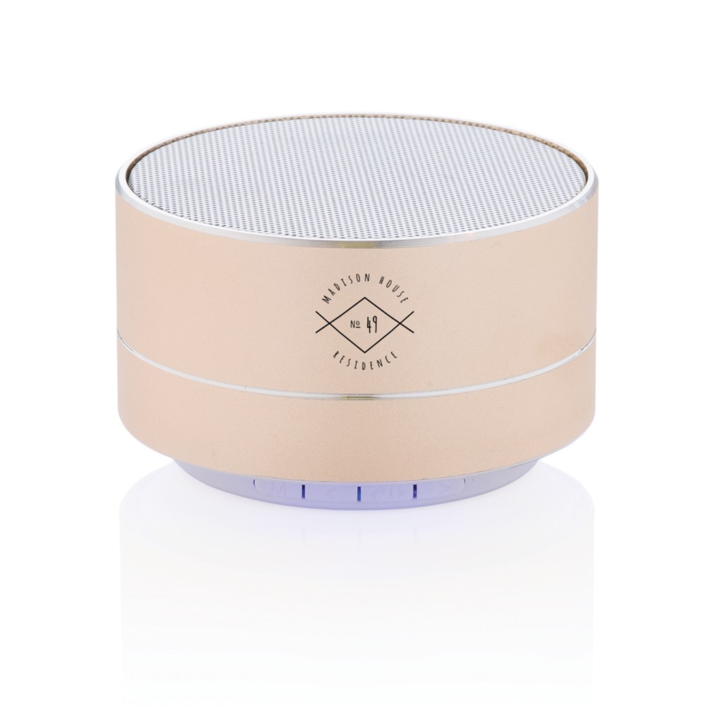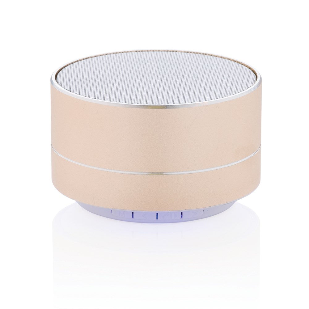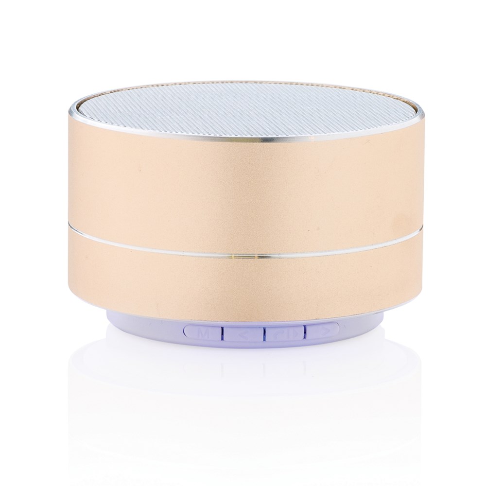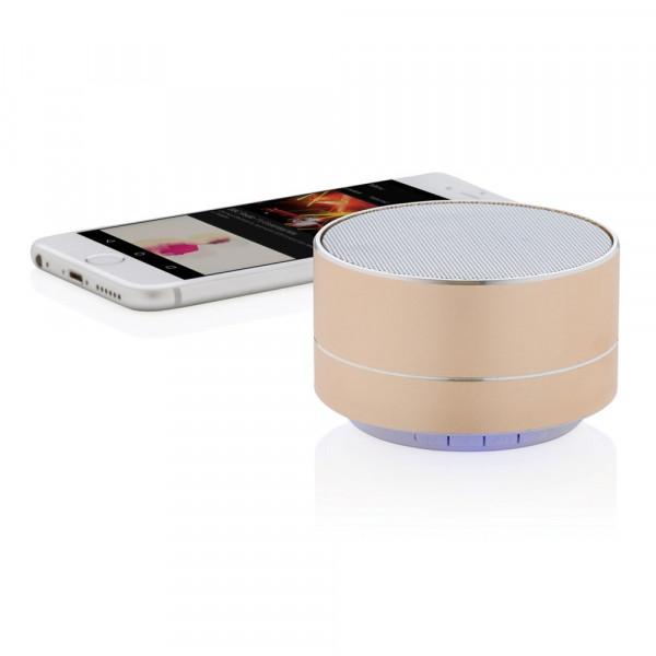3W Lautsprecher aus Aluminium mit eingebauter 300 mAh Lithiumbatterie. Bis zu 10m Reichweite und bis zu 4 Stunden Musikhören mit nur einem Ladevorgang. Stilvolles blaues Licht am Boden. Beantworten Sie eingehende Anrufe mit der praktischen Abnehmefunktion.