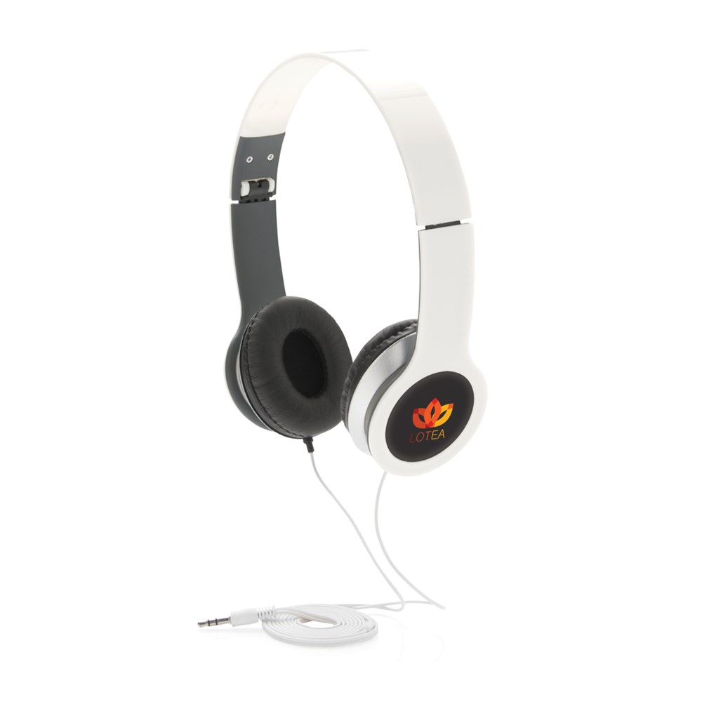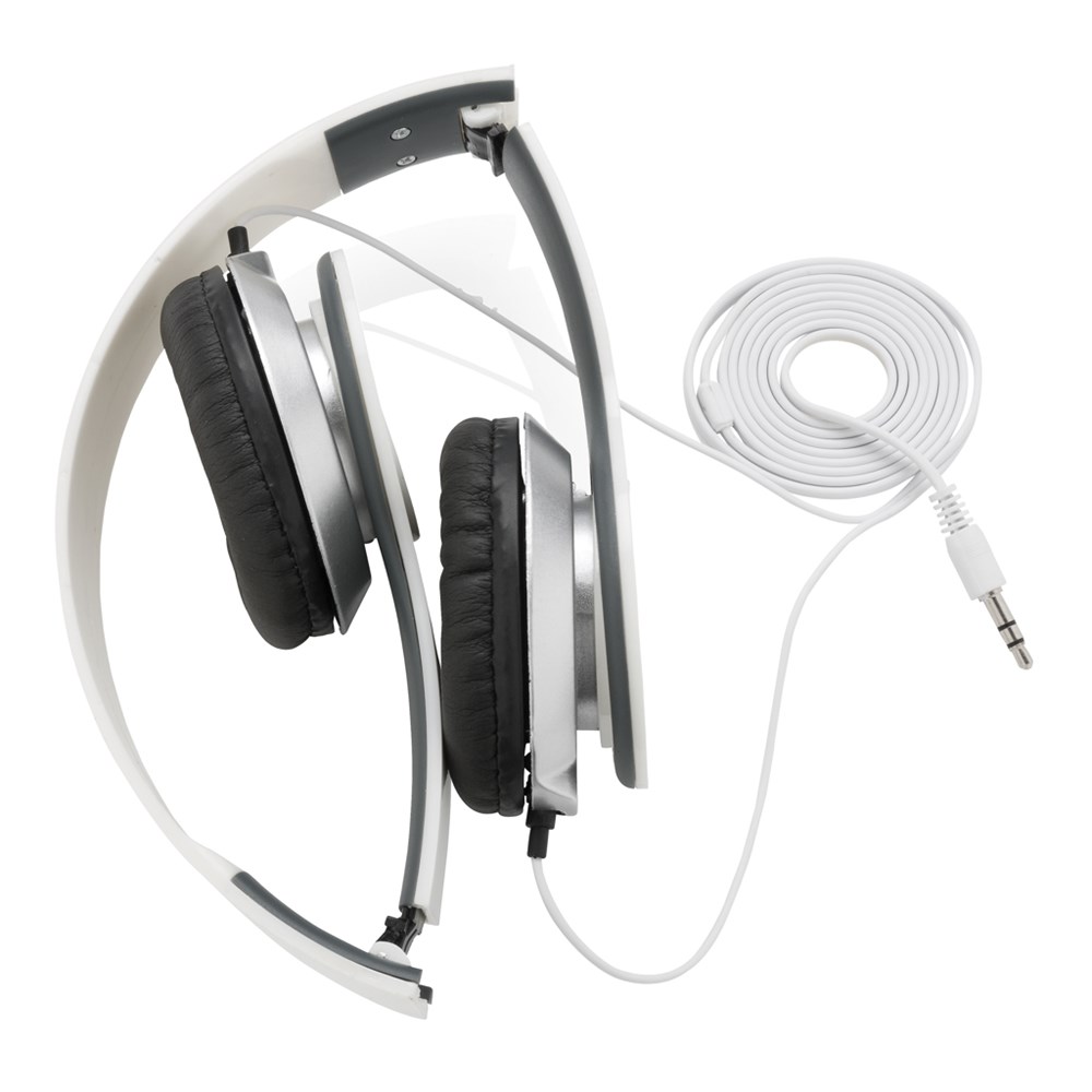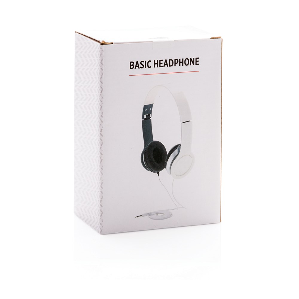 Leichter und faltbarer Kopfhörer mit 3.5mm Anschluss für Smartphone, Computer oder Laptop. Aus APS Plastik, verpackt in einer bunten Geschenkbox.