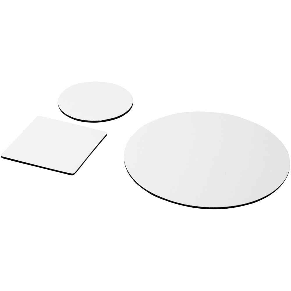 Besteht aus einem Q-Mat® Mousepad und einem Set aus zwei passenden Untersetzern versehen mit Ihrem Firmendesign. Das Set besteht aus einem runden Mousepad (0,3 x ø 20 cm), einem quadratischen (0,3 x 9,8 x 9,8 cm) und einem runden Untersetzer (0,3 x ø 9,8 cm).