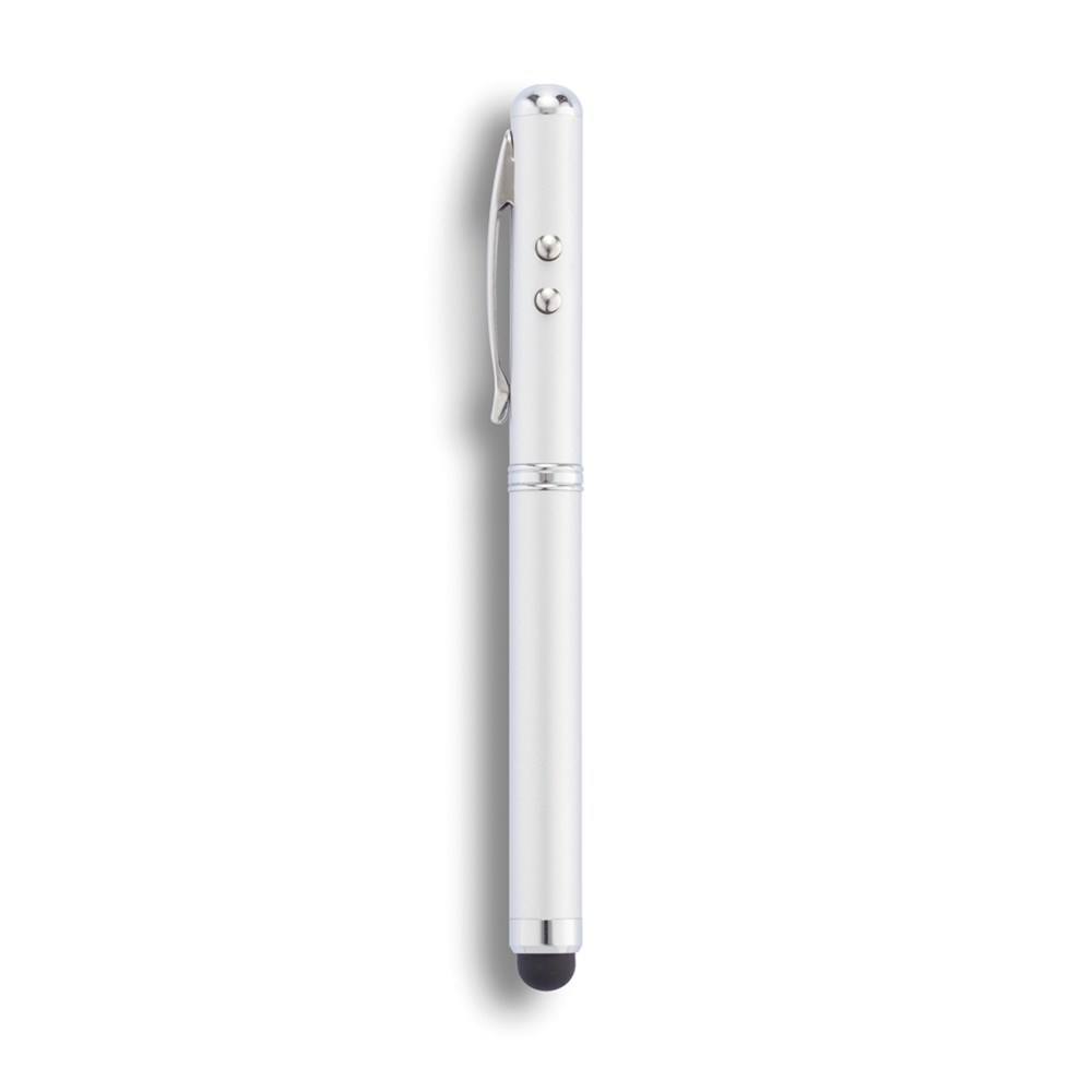 Schwarzschreibender Kugelschreiber mit Stylus-Funktion und integriertem Laserpointer sowie kleiner Leuchte.