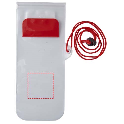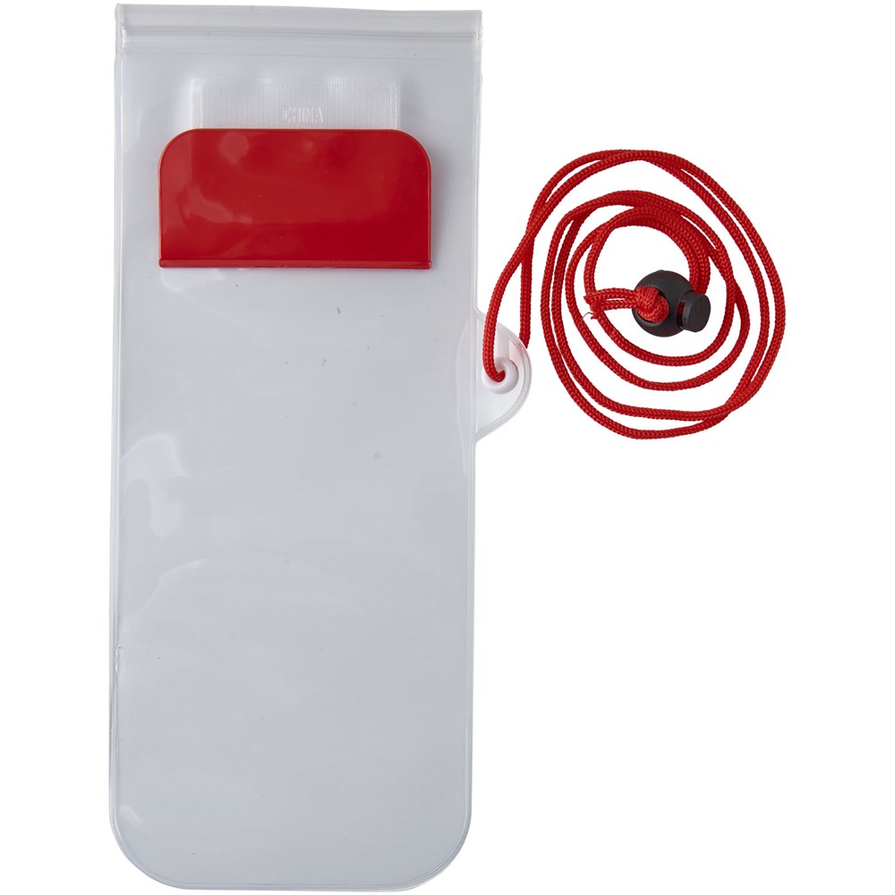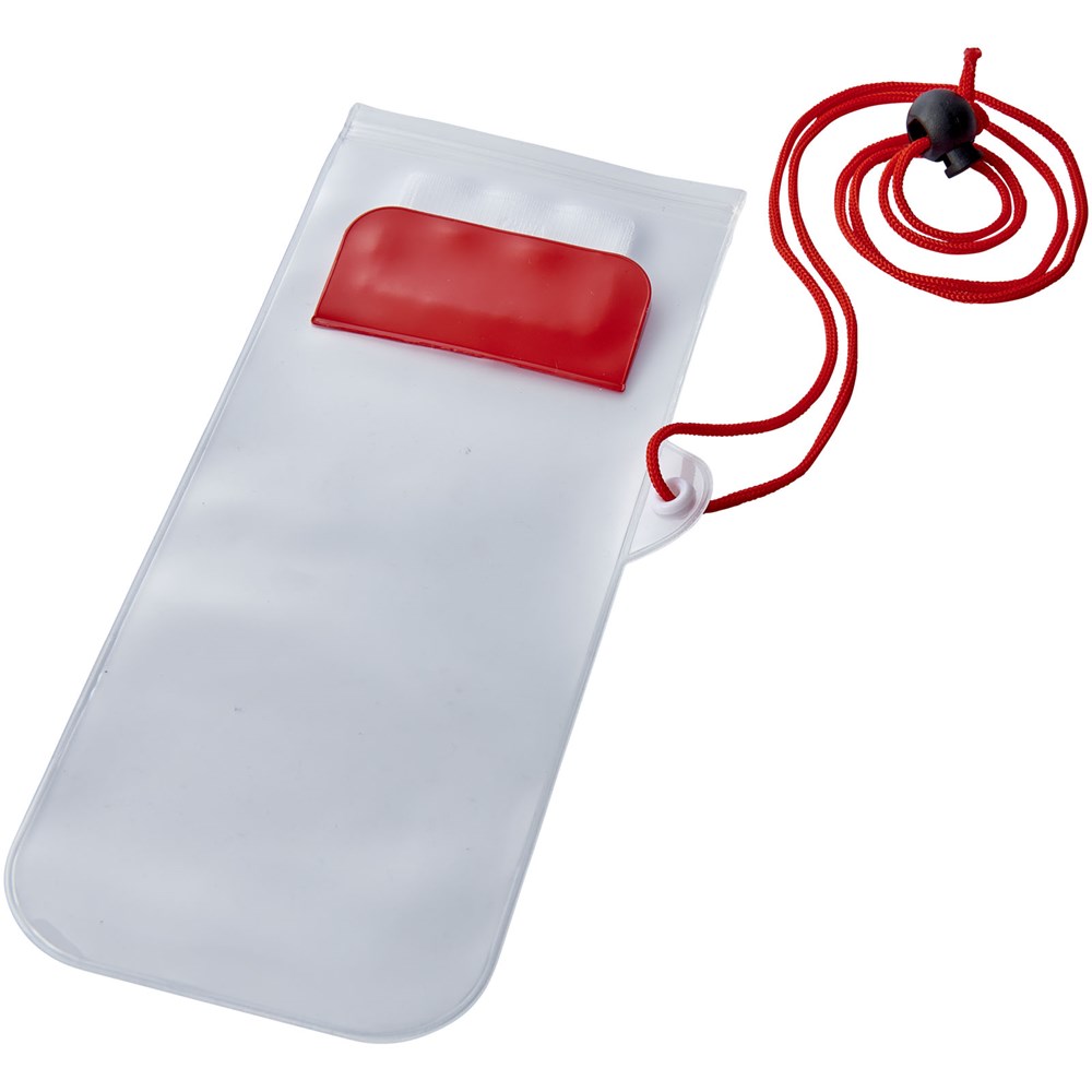 Aufbewahrungsbeutel mit milchiger, weißer Rückseite, transparentem, klarem Touchscreen Frontfenster mit Reißverschluss und farbigem Überschlag mit Klettverschluss. Inklusive Nackenband mit Kordelzug.