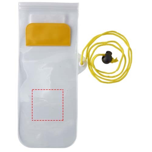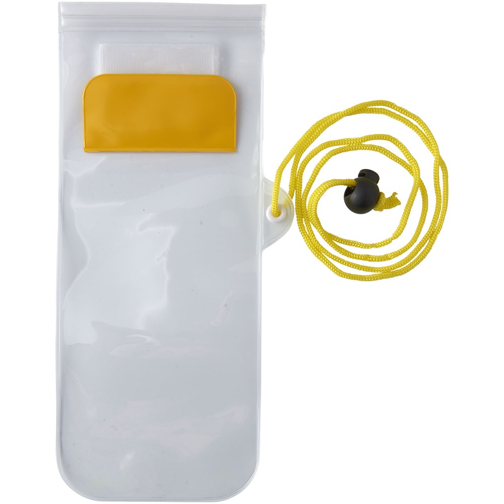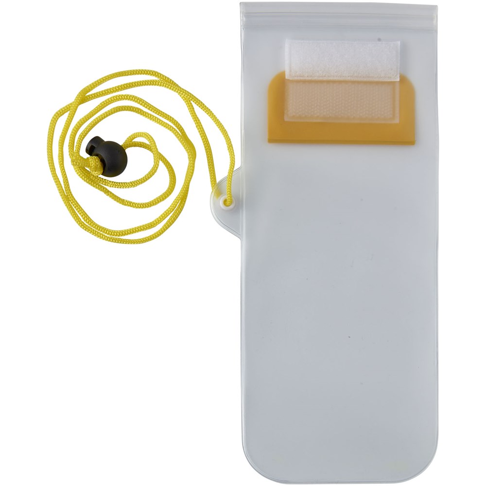 Aufbewahrungsbeutel mit milchiger, weißer Rückseite, transparentem, klarem Touchscreen Frontfenster mit Reißverschluss und farbigem Überschlag mit Klettverschluss. Inklusive Nackenband mit Kordelzug.