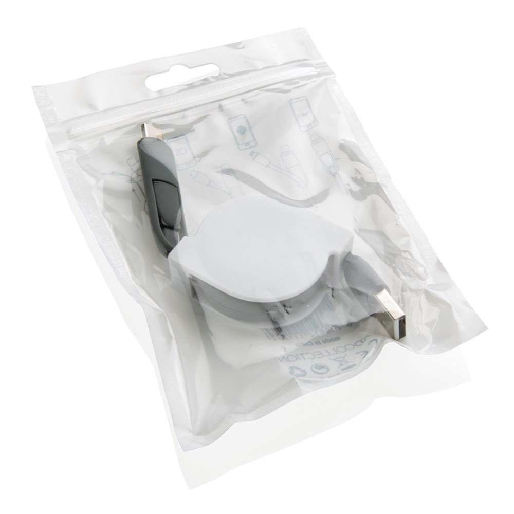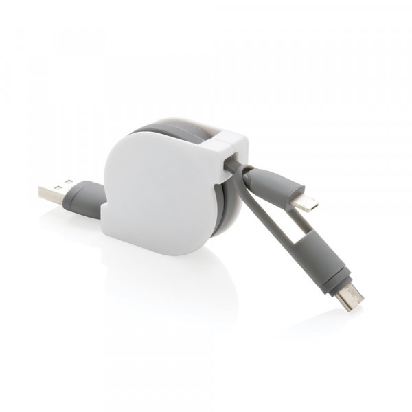 Kompaktes und ausziehbares 3-in-1 Ladekabel mit Type-C USB und zweiseitigem Anschlußstecker für iOS und Android Geräte, die einen Micro-USB Anschluß benötigen. Durch den Aufrollmechanismus kann das 100 cm Kabel, das auch zur Synchronisation Ihrer Daten verwendet werden kann, ohne jeglichen Kabelsalat überall hin mitgenommen werden. ABS-Gehäuse und TPU-Kabel.