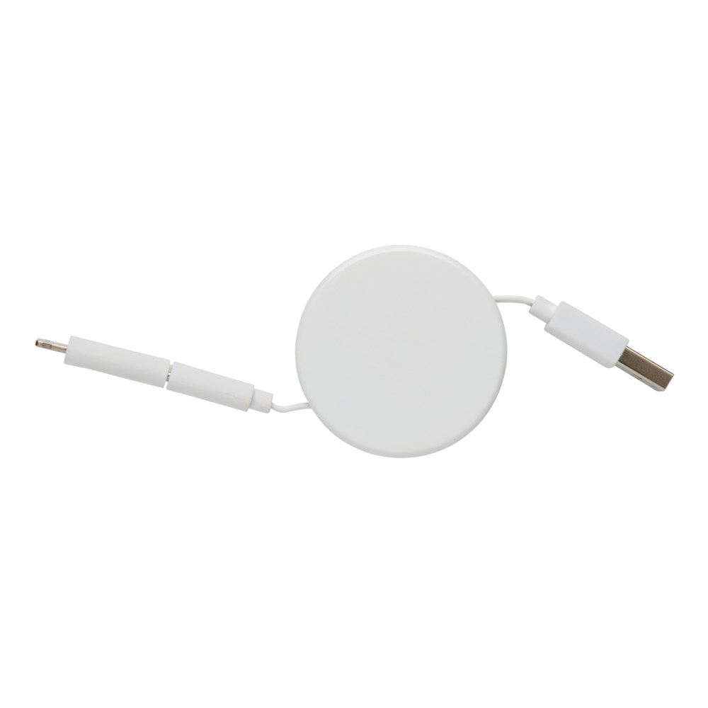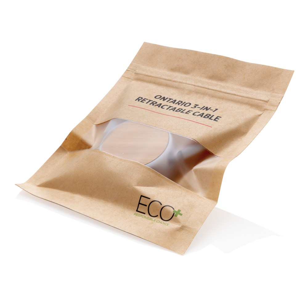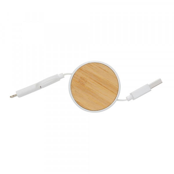 Kompaktes und aufrollbares ECO 3-in-1 Ladekabel mit Type-C und doppelseitigem Micro-USB und Lightning Anschluß. Durch den Aufrollmechanismus kann das 100cm Kabel dennoch klein und kompakt verstaut werden. Das Gehäuse besteht aus ABS und Bambus, das Kabel aus TPU. Verpackt in ECO Papiertasche