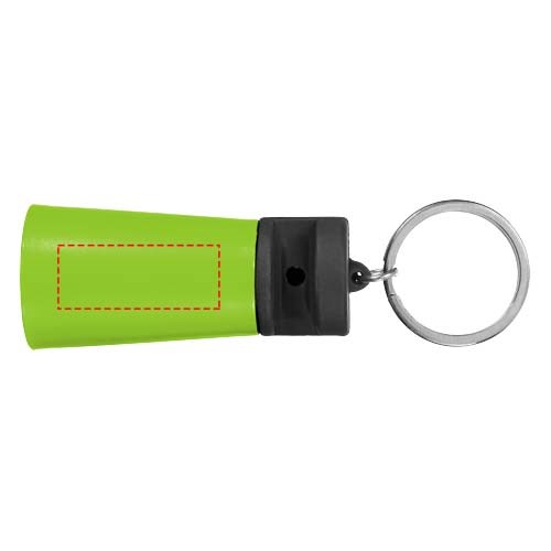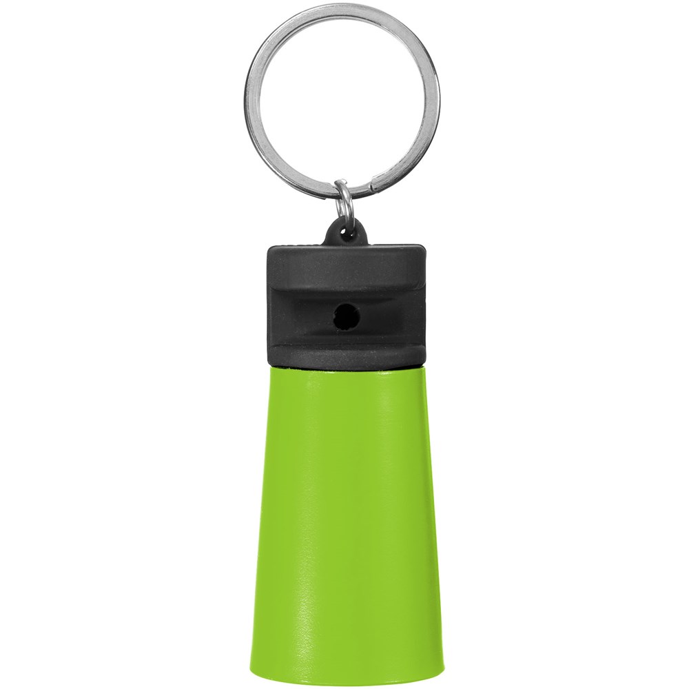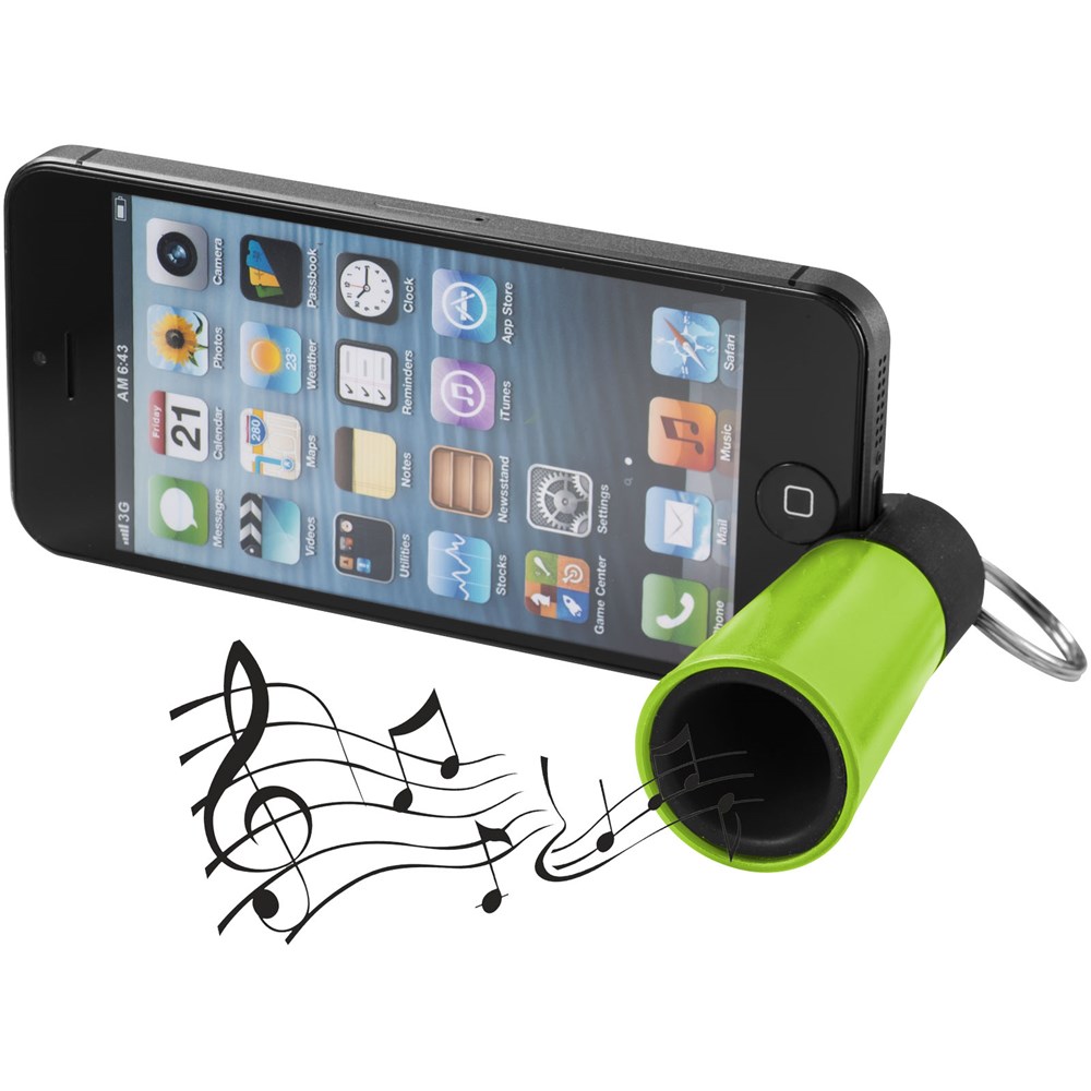 Handlicher Medienständer mit integriertem Verstärker an einem geteilten Schlüsselring aus Metall. Mit iPhone®-Geräten kompatibel.