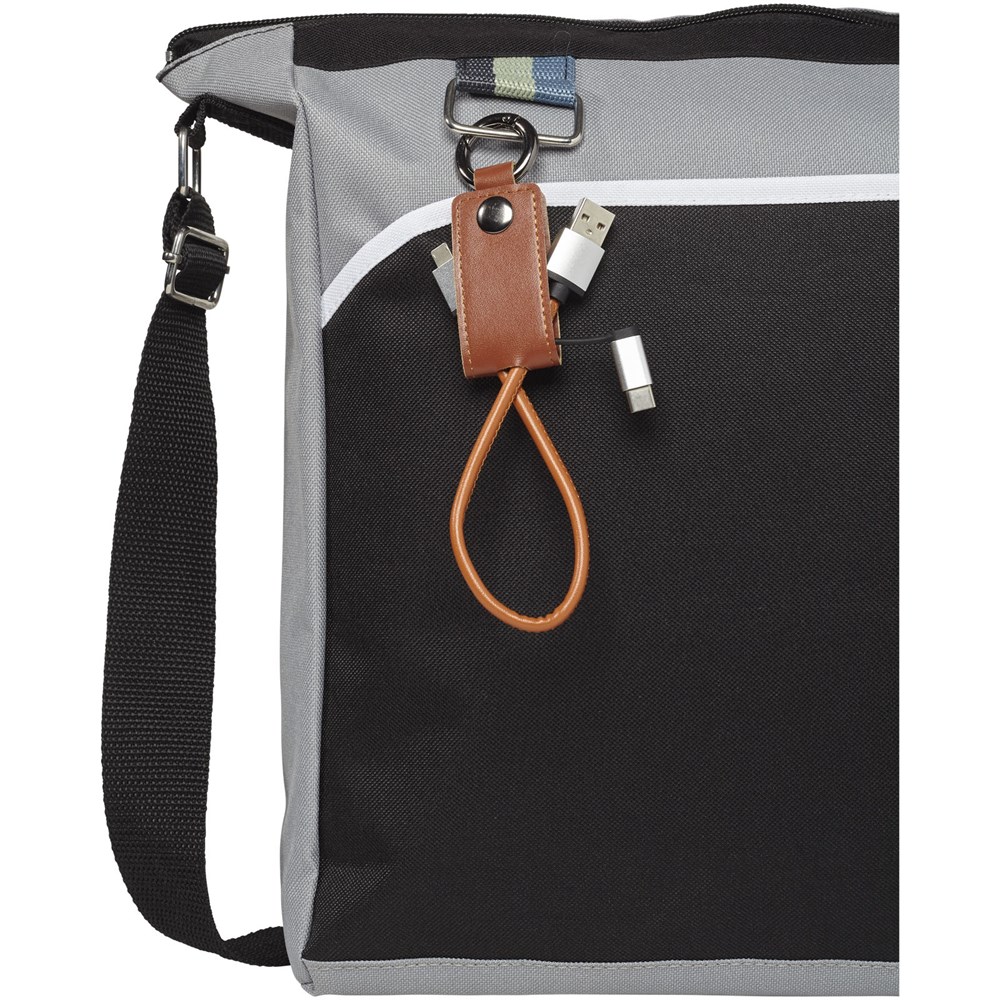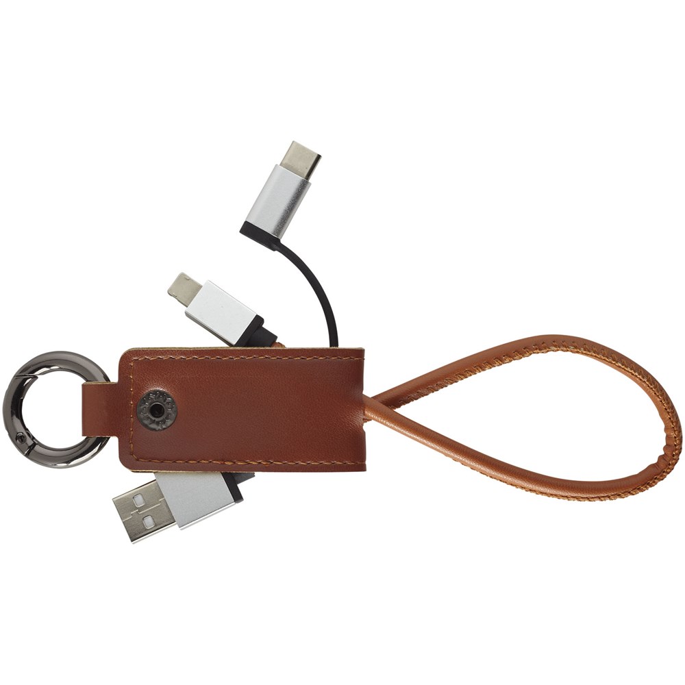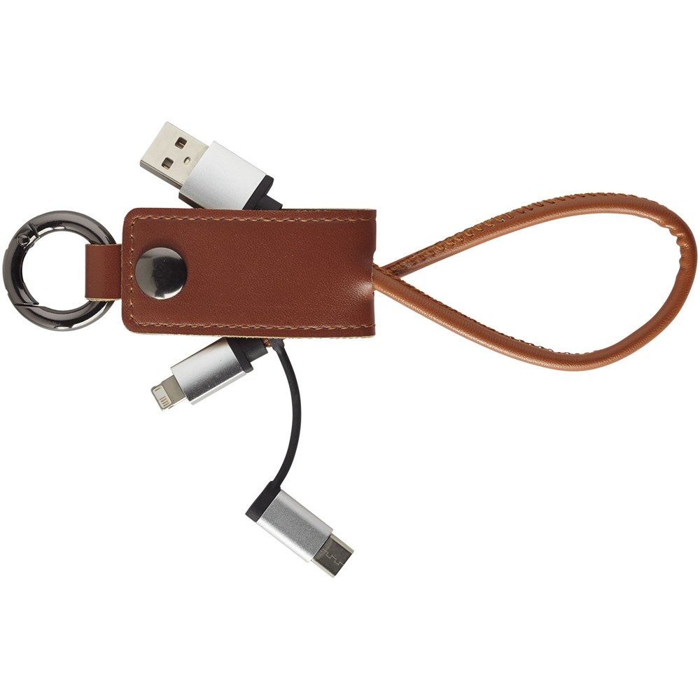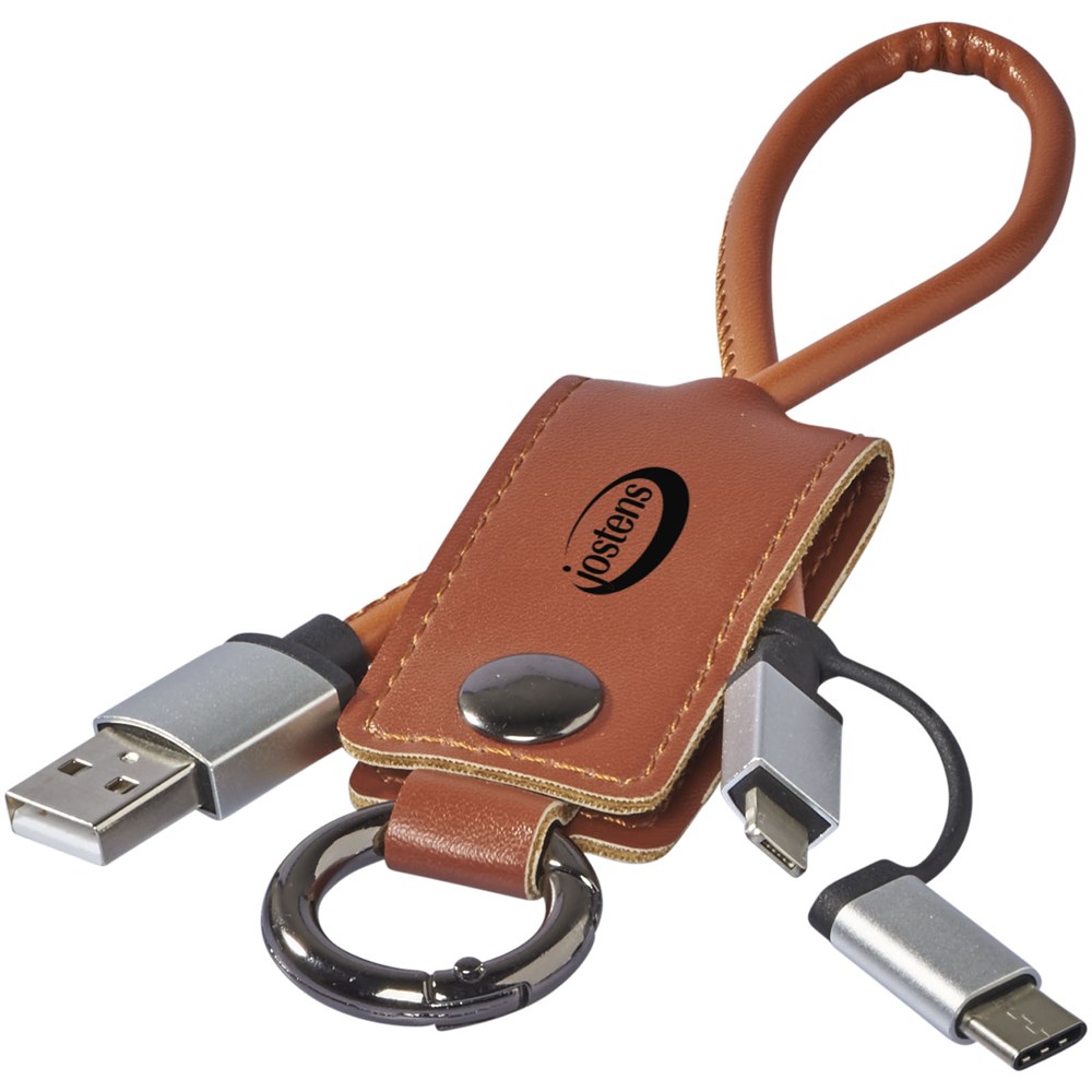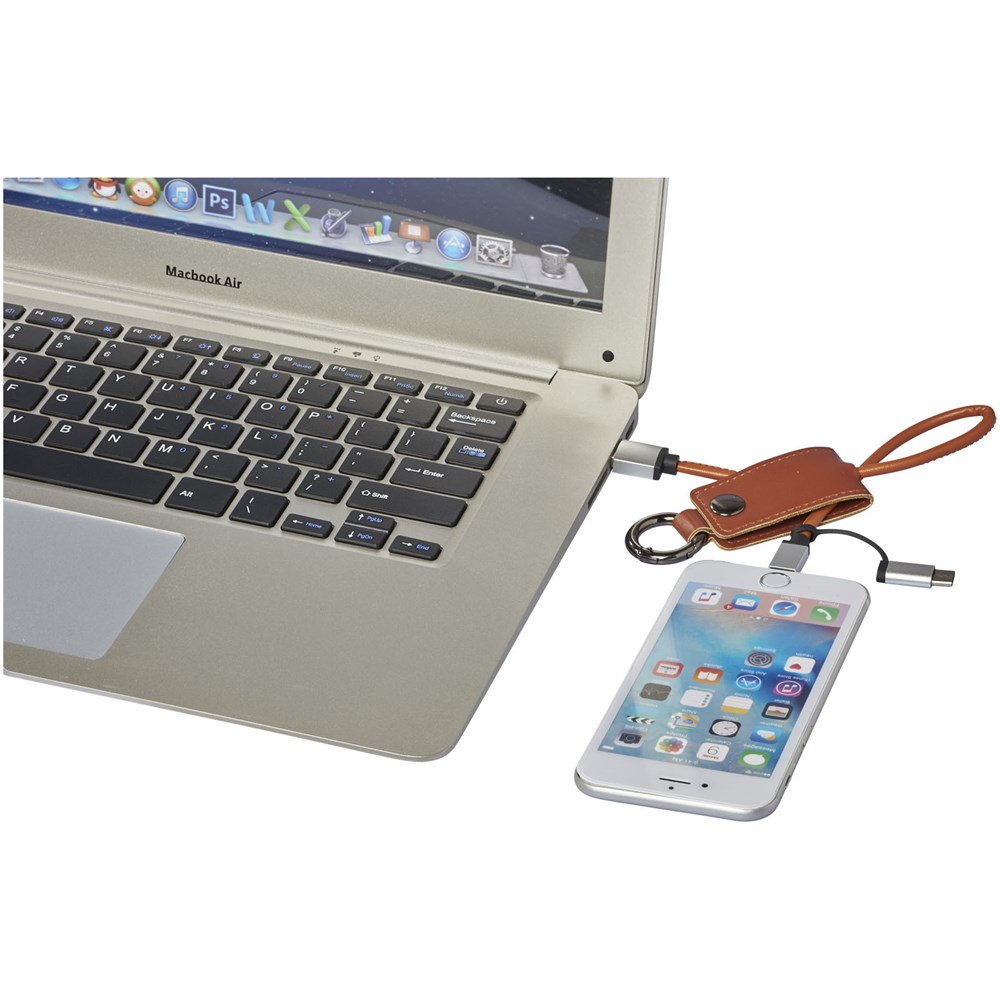 Dieses praktische Ladekabel ist mit einer weichen Schutzklappe ummantelt, die einen USB-Typ C-Adapter und eine 2 in 1 Dual-kompatiblen Adapter für Apple iOS und Android Geräte enthält. Der Ring befestigt das Ladekabel an Ihre Schlüssel oder Tasche.