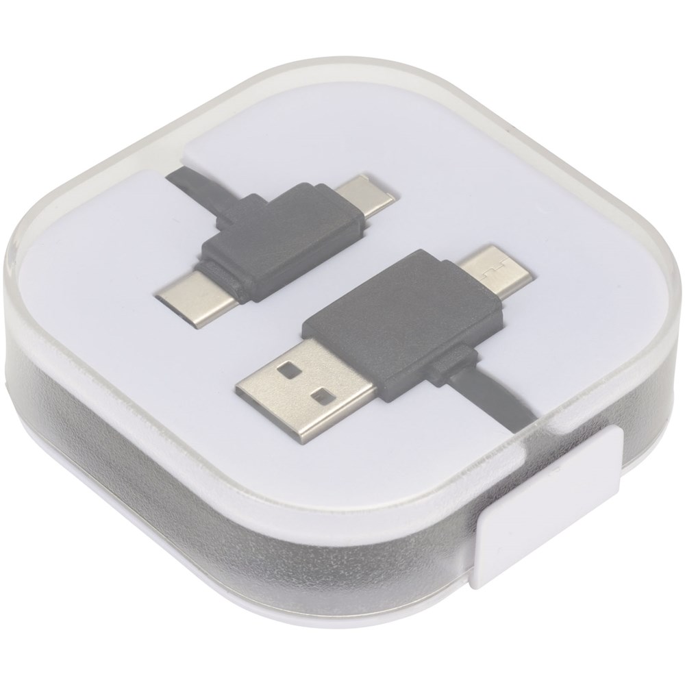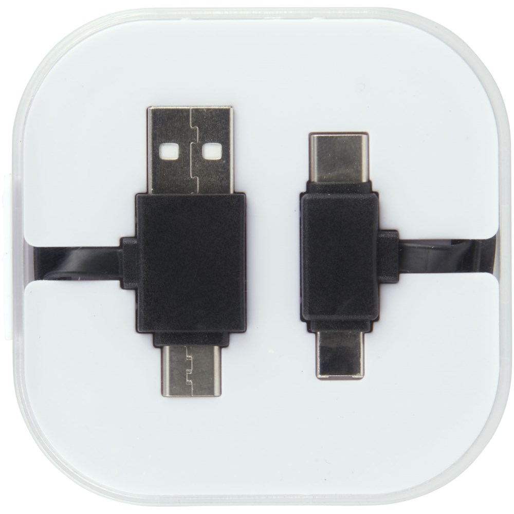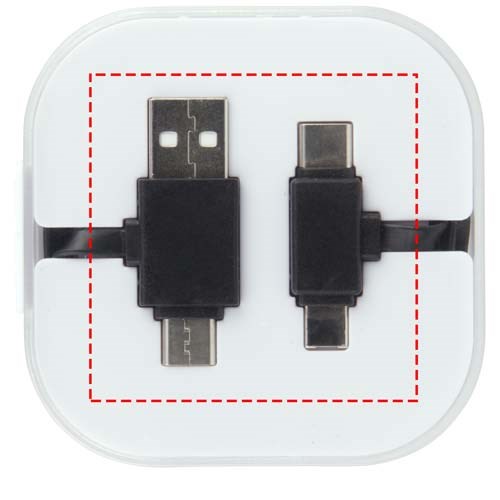 Das 4-in-1-Ladekabel in einer Hülle hat zwei Typ C, einen USB-Typ A und einen 2-in-1-Dual-kompatibelen Anschluss für Apple iOS und Android Geräte. Sowohl Ladefunktion als auch Datentransfer. Um Apple Geräte zu laden, nutzen Sie das Kabel mit der Seite, das keine Pins hat. Zum Laden von Android Geräten das Kabel mit der Seite nutzen, dass Pins hat.