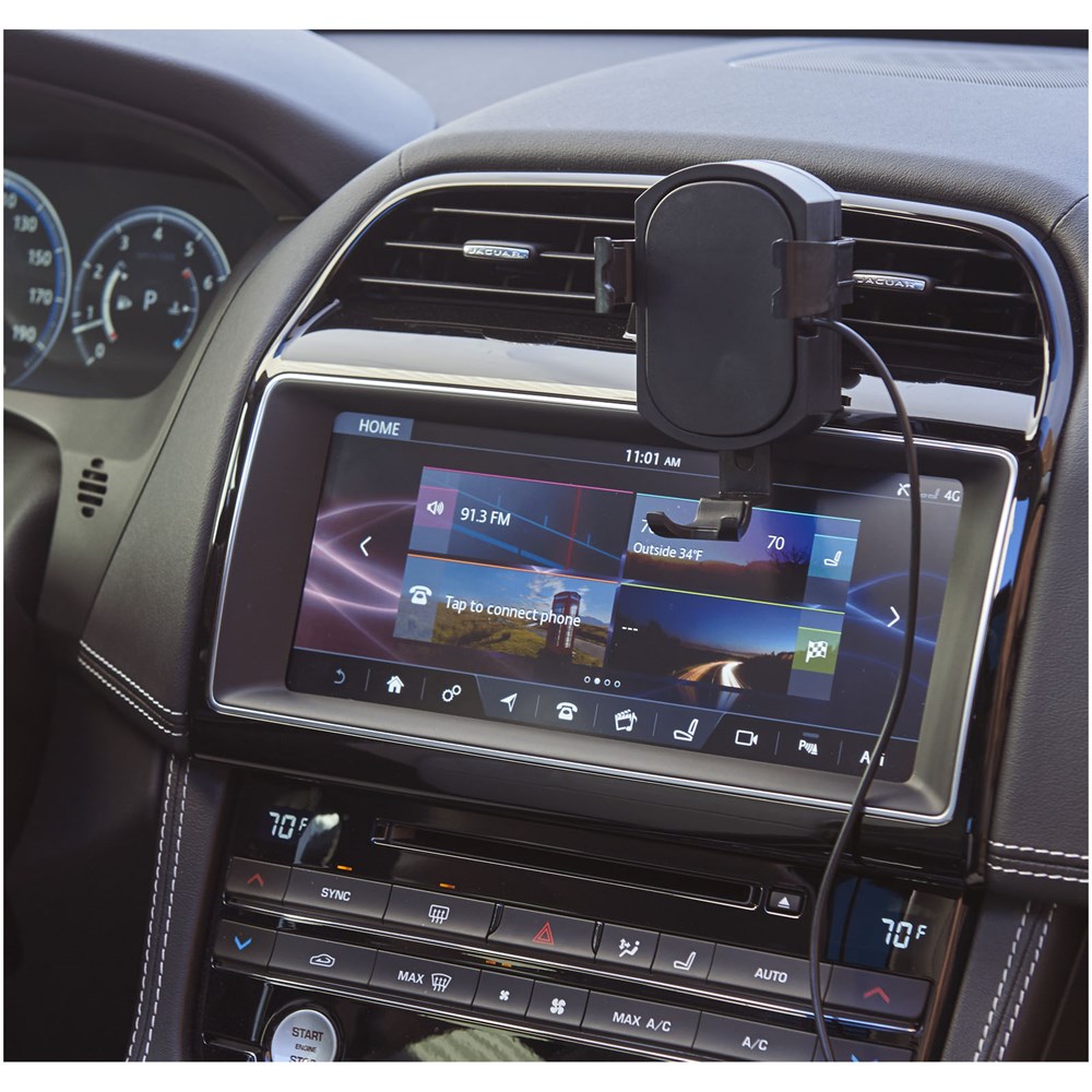 Die abnehmbare Handyhalterung von Prim beinhaltet ein abnehmbares drahtloses Ladepad, das an einer Autoventilation befestigt werden kann. Das Mikro-Ladekabel wird über den USB-Anschluss mit Strom versorgt und sobald das Telefon eingerastet ist, beginnt der Ladevorgang automatisch.