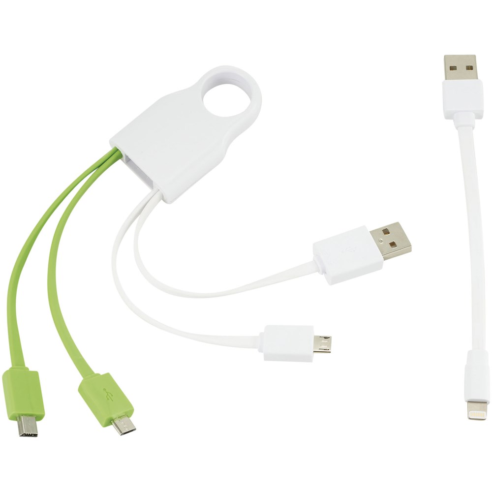 USB Ladekabel mit 5 Anschlüssen, USB Adapter, zwei Micro-USB Adapter, Mini USB Adapter und abnehmbarer MFi zertifizierter Apple® Lightning™ Adapter. Nur ein Micro-USB Adapter und der MFi Lightning™ Adapter unterstützen die Datenübertragung.