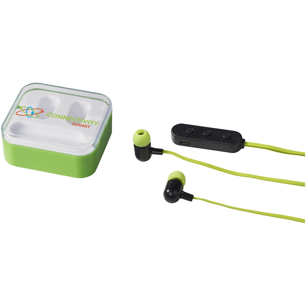 Leichte Bluetooth® Ohrhörer mit einer internen, wiederaufladbaren Batterie, die bis zu 2,5 Stunden Non-Stop Musik bei max. Lautstärke bietet. Die Ohrhörer verfügen über eine eingebaute Musiksteuerung und ein Mikrofon. Micro-USB Ladekabel enthalten. Lieferung in einem transparenten Gehäuse.