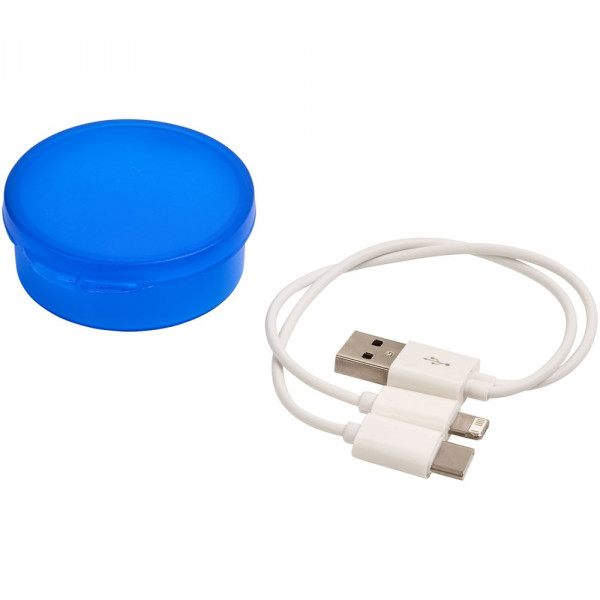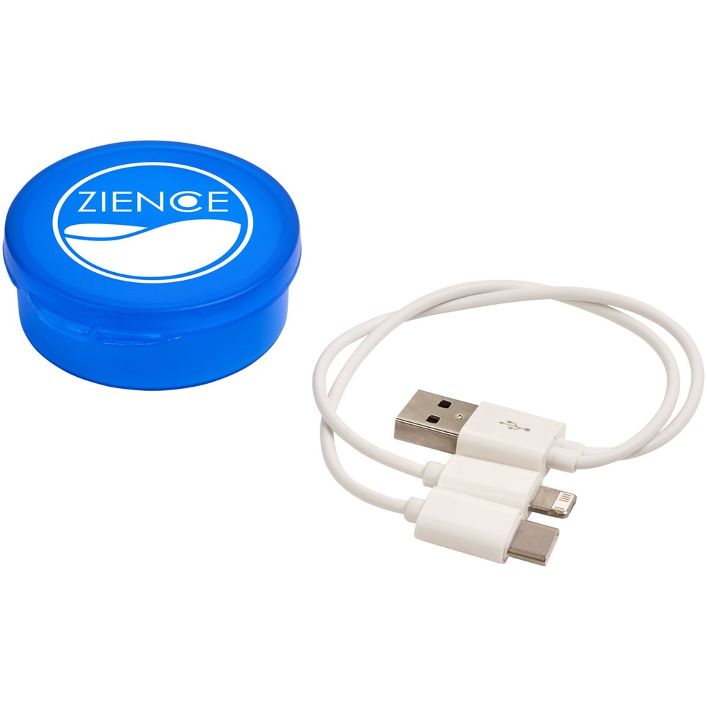 Das Versa 3-in-1-Ladekabel wird in einem runden Etui mit einem USB-Mehrfachkabel geliefert, das einen USB Typ C-Stecker und einen doppelt kompatiblen 2-in-1-Stecker für Apple® iOS- und Android-Geräte enthält.