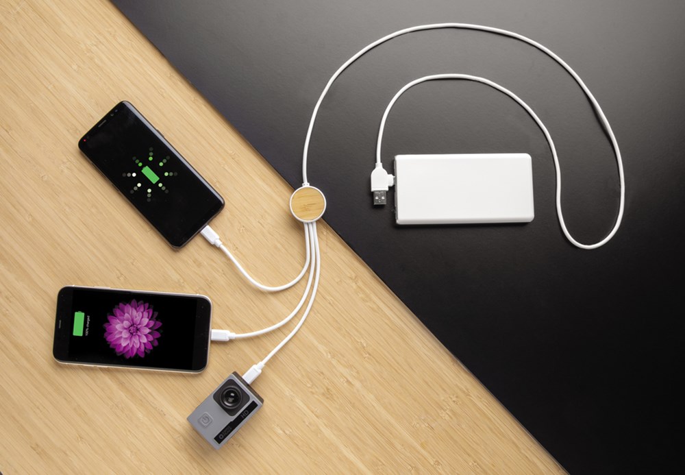 Multikabel mit 5 verschiedenen Anschlüssen: USB C-Eingang & USB A-Eingang; Type-C Output, iOS-Output und Micro-USB-Output. Auf diese Weise können Sie das Kabel auch mit Typ C-Ausgabegeräten verwenden, die in der neueren Generation von Telefonen und MacBook-Computern verbaut sind. Das Kabel verfügt außerdem über eine USB-A-Output-Input-Option mit der jedes Gerät von jeder Ausgangsquelle aufgeladen werden kann. Gehäuse aus Bambus und ABS. Das 120cm Kabel aus PVC-freiem TPE.