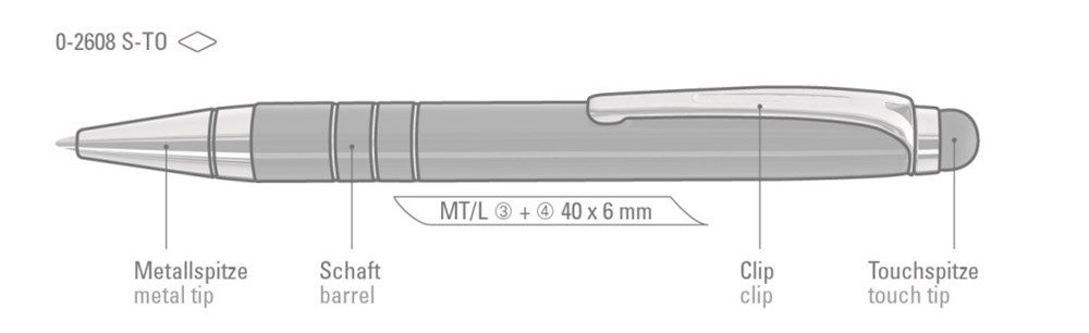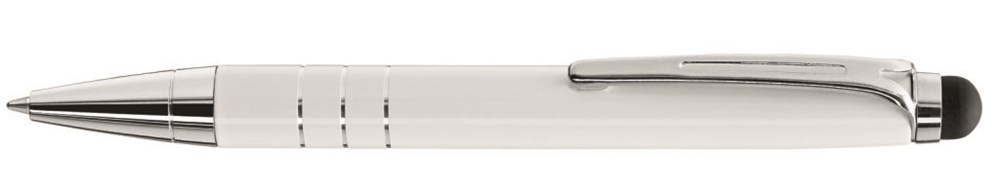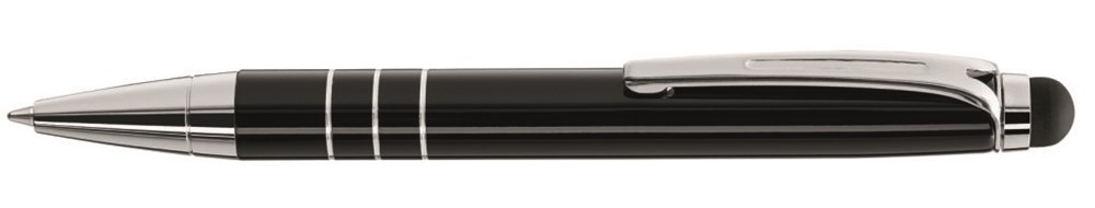 Mini Metall-Drehkugelschreiber mit gummierter Oberseite für die Touchscreensteuerung. Metallzierringe und Beschlagteile glanzverchromt.