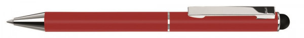 Metall-Drehkugelschreiber mit matter Oberfläche, Metallclip, Metallspitze und gummiertem Schaftende für die Touchscreensteuerung.