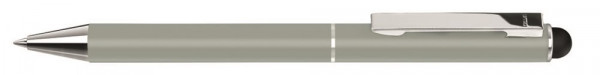 Metall-Drehkugelschreiber mit matter Oberfläche, Metallclip, Metallspitze und gummiertem Schaftende für die Touchscreensteuerung.
