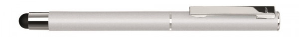 Metall-Rollerball mit matter Oberfläche, Metallclip und Zierring in silber glänzend mit gummiertem Schaftende für die Touchscreensteuerung, Griffzone schwarz.