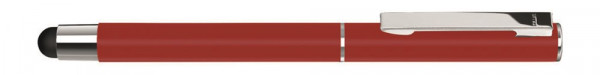 Metall-Rollerball mit matter Oberfläche, Metallclip und Zierring in silber glänzend mit gummiertem Schaftende für die Touchscreensteuerung, Griffzone schwarz.
