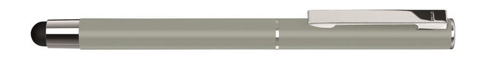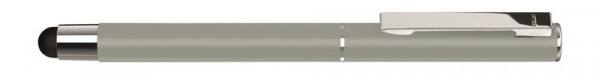 Metall-Rollerball mit matter Oberfläche, Metallclip und Zierring in silber glänzend mit gummiertem Schaftende für die Touchscreensteuerung, Griffzone schwarz.