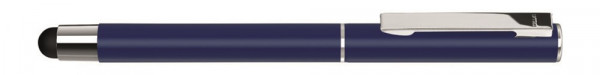 Metall-Rollerball mit matter Oberfläche, Metallclip und Zierring in silber glänzend mit gummiertem Schaftende für die Touchscreensteuerung, Griffzone schwarz.