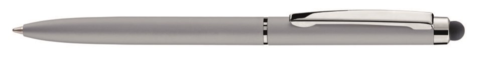 Metall-Drehkugelschreiber mit farbig matter oder weiß glänzender Oberfläche. Beschlagteile silber glänzend, gummiertes Schaftende für die Touchscreensteuerung.