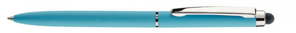 Metall-Drehkugelschreiber mit farbig matter oder weiß glänzender Oberfläche. Beschlagteile silber glänzend, gummiertes Schaftende für die Touchscreensteuerung.