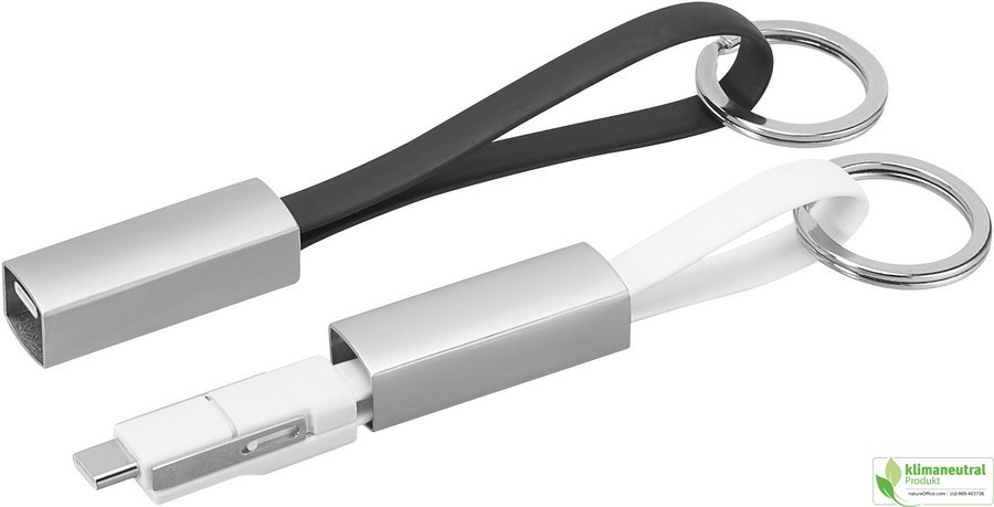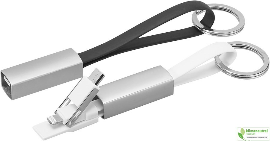 Immer das passende Kabel zu Hand: der schöne, praktische Schlüsselanhänger mit USB-Kabel und 3-in-1 Anschluss. Durch Drehen des Anschlusses um 180° universell verwendbar für Android und iOS, aufgesteckt ist ein Type-C-Stecker. Mit Lade- und Datentransferfunktion. Nicht quickcharge-fähig. Material: ABS/TPE/Metall Farbe: Schwarz Einzelverpackung mit Sichtfenster Maße:150 x 14 mm (Gehäuse), Ø 28 mm (Ring) 12 mm (Kabel) Gewicht: 26 g Werbeanbringung: Hülse auf der Oberseite 35 x 10 mm (L2) Hülse seitlich 35 x 7 mm (L2) Blindgravur auf dem Kabel 45 x 5 mm (L2) Hülse auf der Oberseite 35 x 10 mm (D2) Hülse seitlich 35 x 7 mm (D2) Auf dem Stecker 15 x 6 mm (D2) Clever, praktisch und 100% Klimaneutral