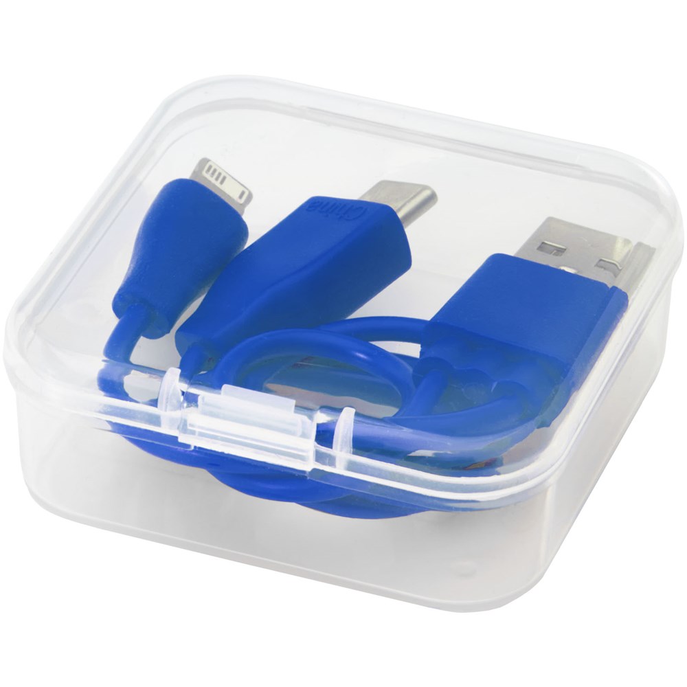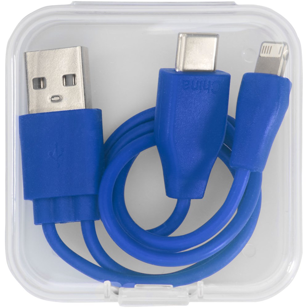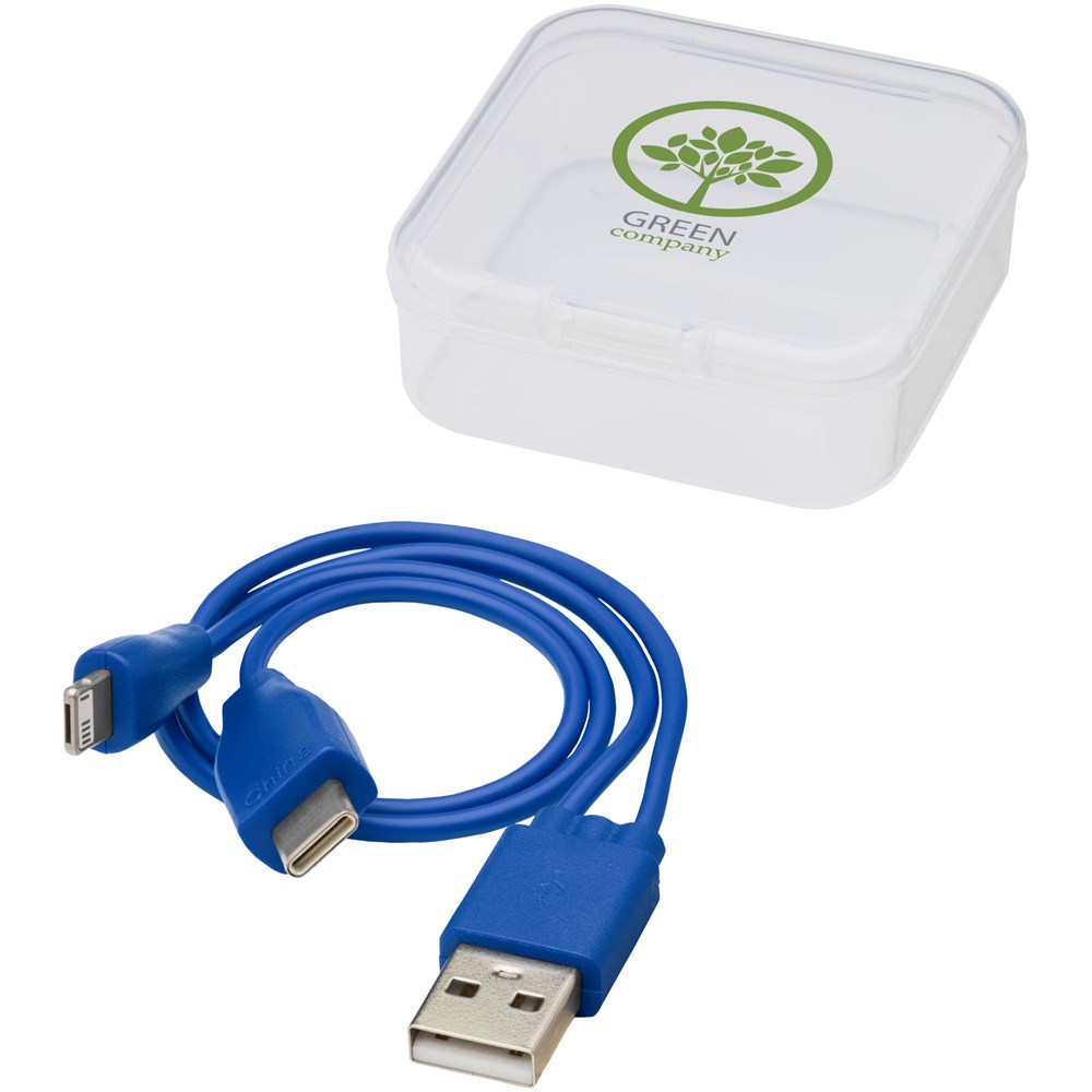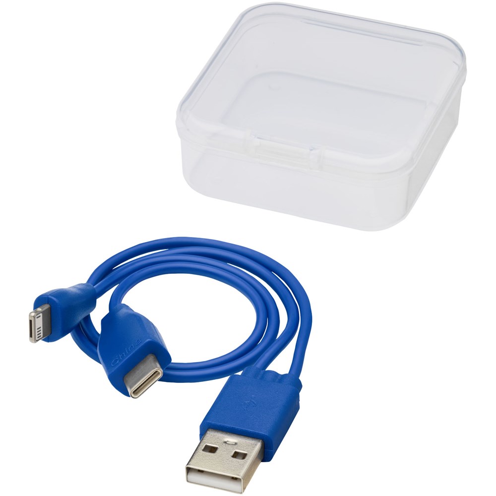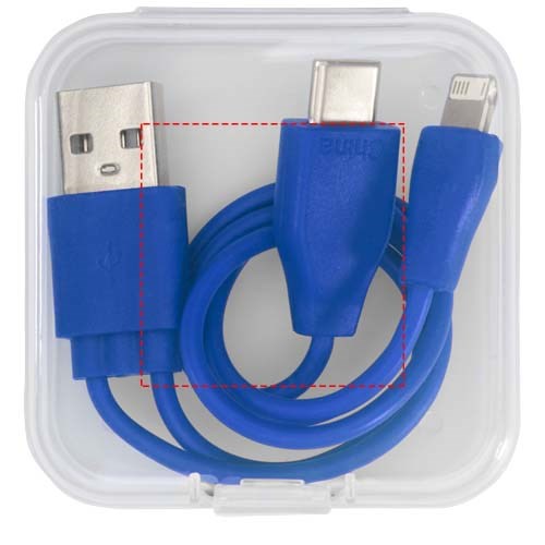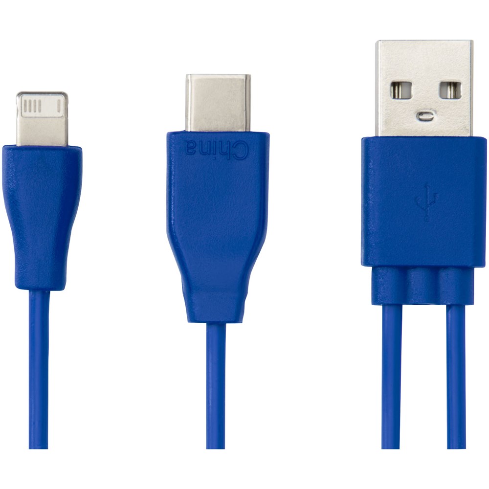 3-in-1 USB-Ladekabel mit einem USB, Typ-C, und einem 2-in-1 doppelt kompatiblen Anschluss für Apple® iOS- und Android-Geräte. Mikro-USB-Ausgang und 2-in-1 Anschluss bis zu 2 A. Typ-C Ausgang bis zu 3 A. Geliefert in einer Schutzhülle.