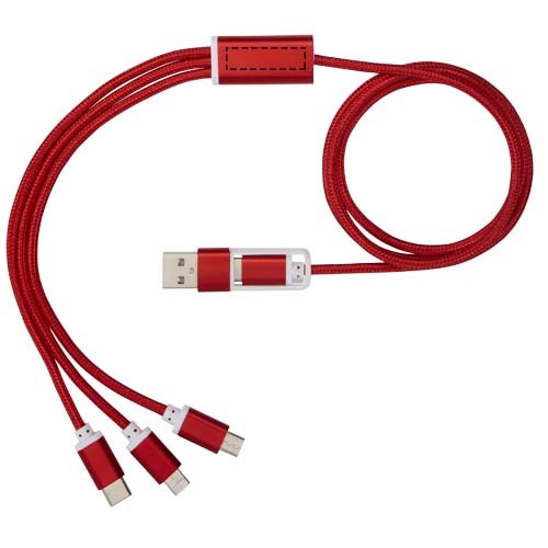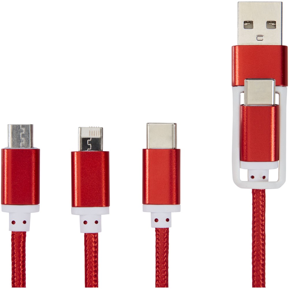 Geflochtenes Nylon-Ladekabel mit fünf verschiedenen Anschlüssen: Typ-C-Eingang, USB-A-Eingang, Typ-C-Ausgang, Apple® iOS-Ausgang und Mikro-USB-Ausgang. Dadurch kann das Kabel auch mit Typ-C-Ausgabegeräten verwendet werden, die in der neueren Generation von Telefonen und MacBook-Computern enthalten sind. Das Kabel ist 100 cm lang. 2-in-1-Ausgang bis zu 2 A. Typ-C-Ausgang bis zu 3 A Strom.