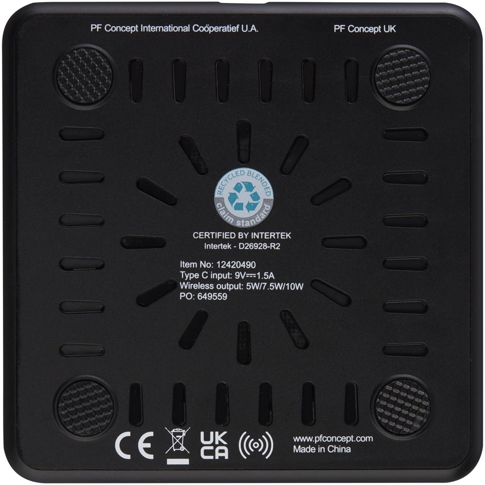 Kabelloses Ladepad aus RCS zertifiziertem recyceltem ABS Kunststoff. RCS (Recycled Claim Standard) ist eine Norm zur Überprüfung des Recyclinganteils eines Produkts entlang der gesamten Lieferkette. Verbinden Sie das Ladepad mit einem Computer oder Laptop und legen Sie das Gerät darauf, um den Ladevorgang zu starten. Die kabellose Leistungsabgabe beträgt 10 W (max.) für schnelles Aufladen. Kompatibel mit allen Qi Geräten (iPhone 8 oder höher und Android Geräte, die kabelloses Laden unterstützen). Auslieferung in einer Geschenkbox inklusive Bedienungsanleitung (beides aus nachhaltigen Materialien).