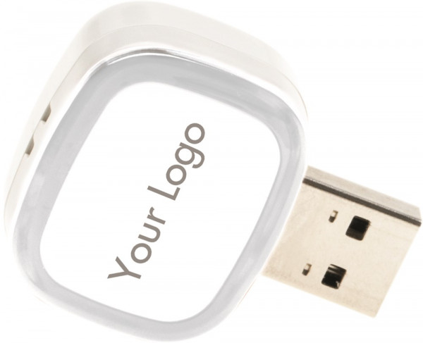 USB-Lampe - Klein aber extrem OHO! Mit diesem nützlichen Accessoire wird aus jeder Powerbank eine Taschenlampe mit acht superhellen LEDs / SMD (1,5 W). Die rückseitige Werbefläche wird von einem transparenten Farbring umrandet.