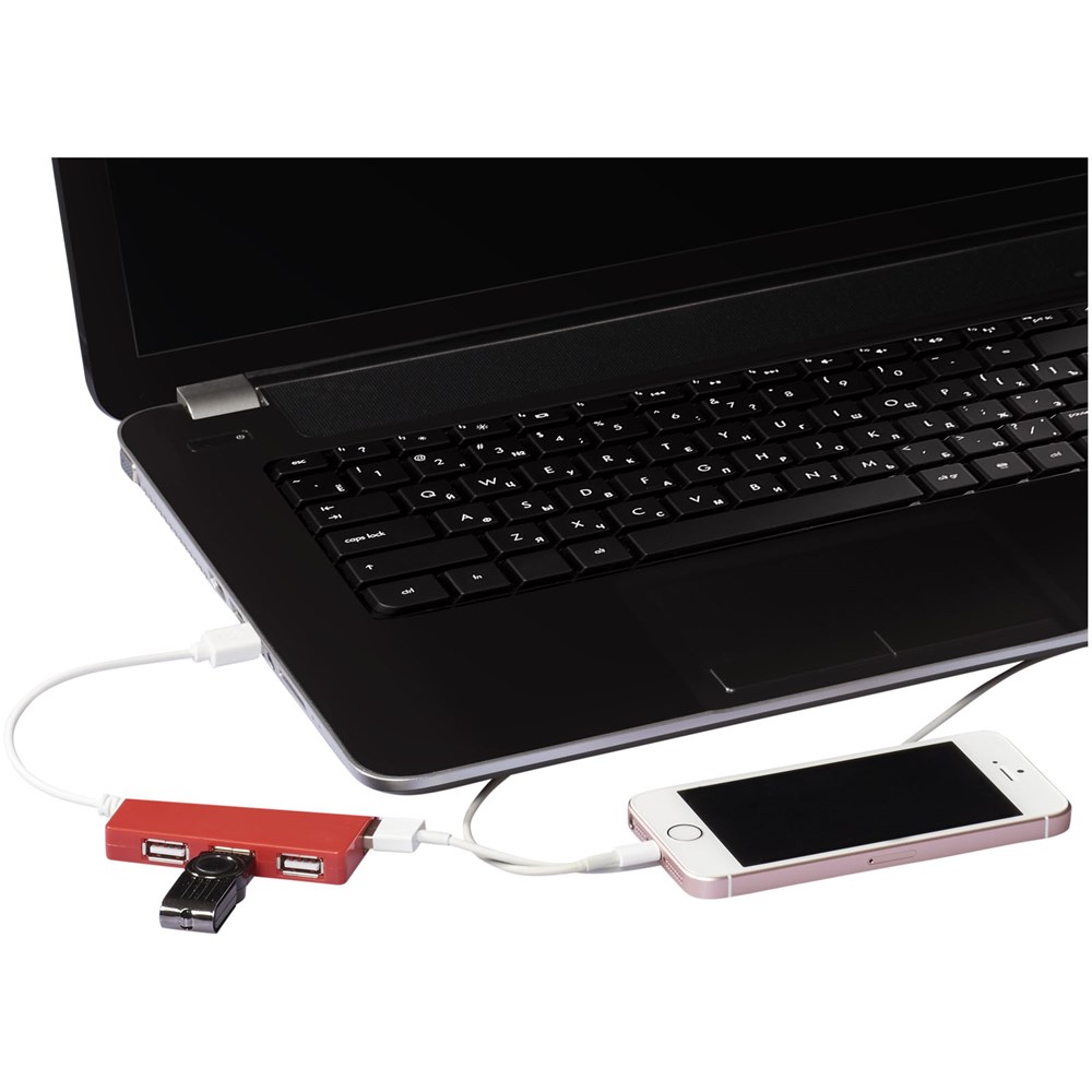 Kleiner 4-Port USB 2.0 Hub in Form einer Ziegel. Kompatibel mit jedem USB-Port. Ermöglicht Ihnen, mehrere Geräte gleichzeitig aufzuladen. Kabellänge beträgt 19,3 cm.