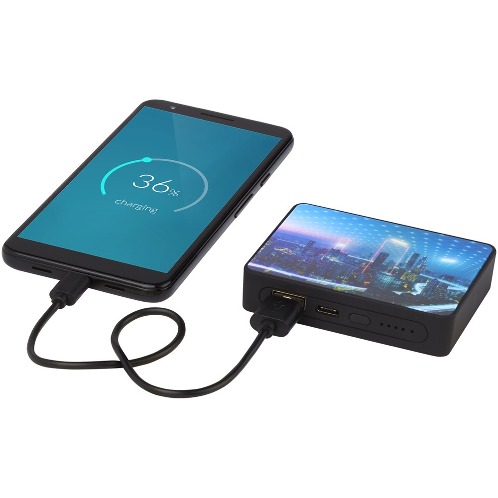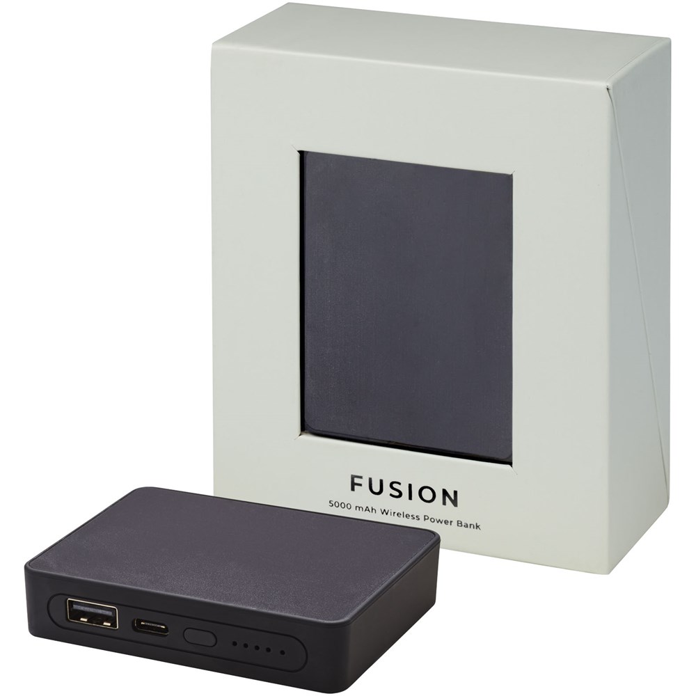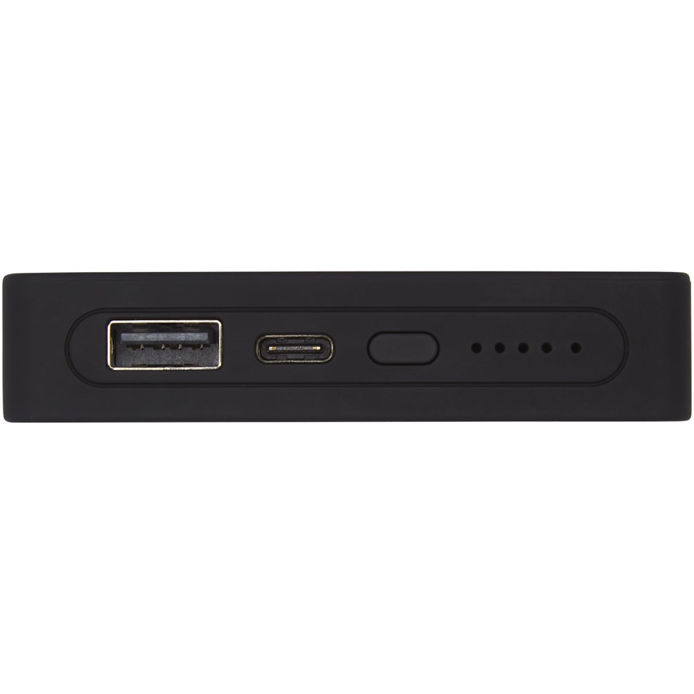 5000 mAh kabellose Powerbank mit gehärteter Glasabdeckung, geeignet für individuelle Werbeanbringung. Kompatibel mit allen Qi-fähigen Geräten wie Android der neuesten Generation, iPhone 8 und höher. Leistungsanzeige, die jederzeit den Energiepegel anzeigt. Typ-C-Eingang 5 V/2 A, USB-A-Ausgang 5 V/2 A, Wireless-Ausgang 5 V/1 A, 5 W. Aus ABS Kunststoff mit Gummibeschichtung und gehärtetem Glas auf der Vorderseite. Inklusive PVC-freiem TPE Kunststoff Typ-C-Ladekabel. Verpackung in einer Premium-Geschenkbox.