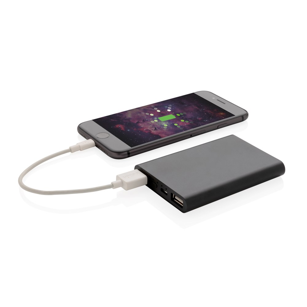Diese ultradünne 5.000 mAh Powerbank aus Aluminium mit einer A-Grade Lithium-Polymer Batterie lädt Ihr Smartphone bis zu 3 mal. Die LED's zeigen Ihnen den Ladestand der Powerbank an. Micro-USB Input: 5V/1.5A. Output: 5W; 5V/2.1A.
