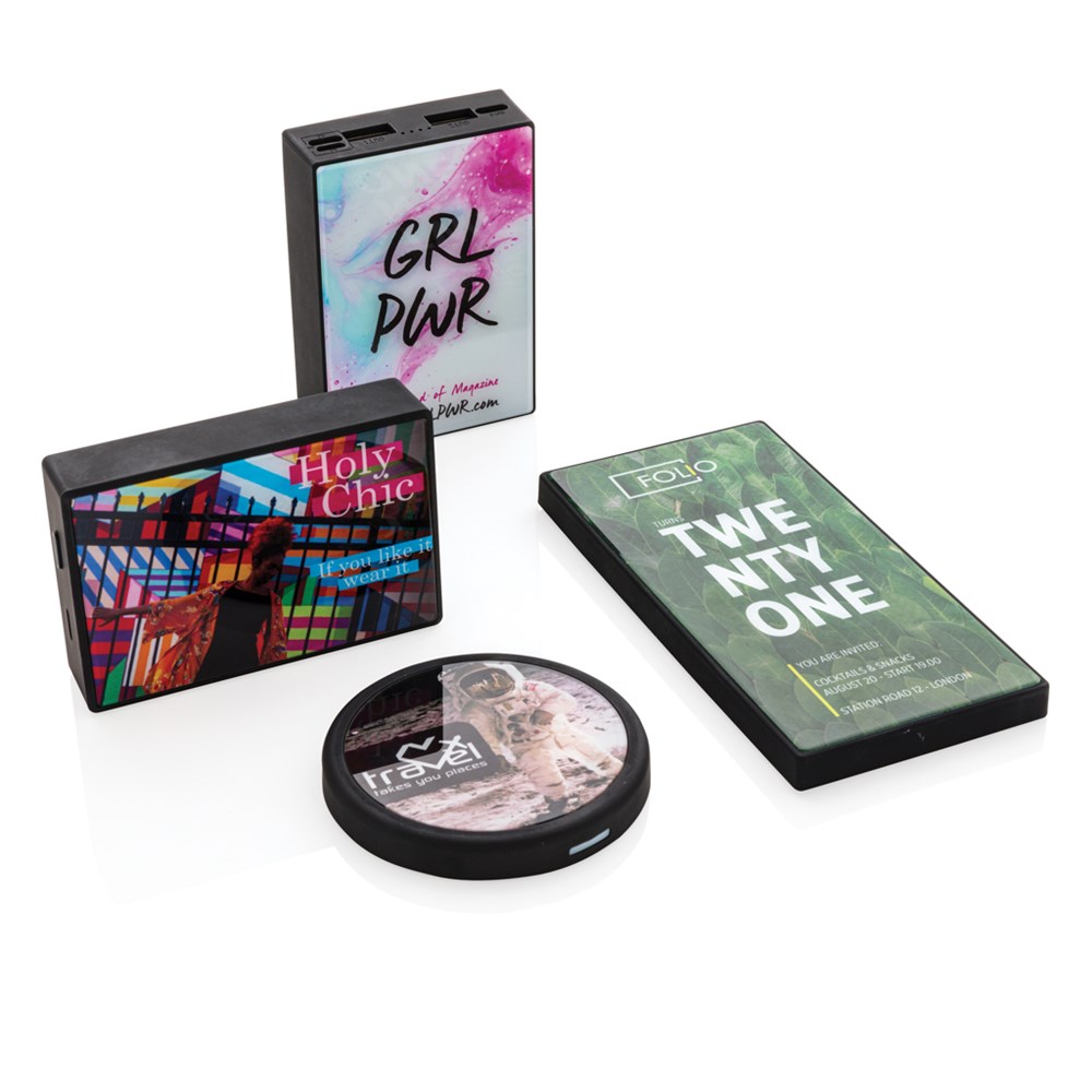 Moderne 5.000 mAh Wireless Powerbank aus ABS mit Sicherheitsglas über Ihrem vollflächigen Digitaldruck - ein ganz besonderes Geschenk. Wireless Charging ist kompatibel mit allen QI-fähigen Geräten wie den Androids der neusten Generation sowie ab dem iPhone 8. Auch das Laden per Kabel ist mit Hilfe der USB Und Type-C Ports möglich. Mit Ladestandsanzeige. Die 5.000 mAh A-Grade Batterie ist eine Lithium-Polymer Batterie. Type-C Input 5V/2A, Micro-USB Input 5V/2A, USB Output 5V/2A, Type-C Output: 5V/2A. Inklusive PVC-freiem TPE Micro-USB Ladekabel.