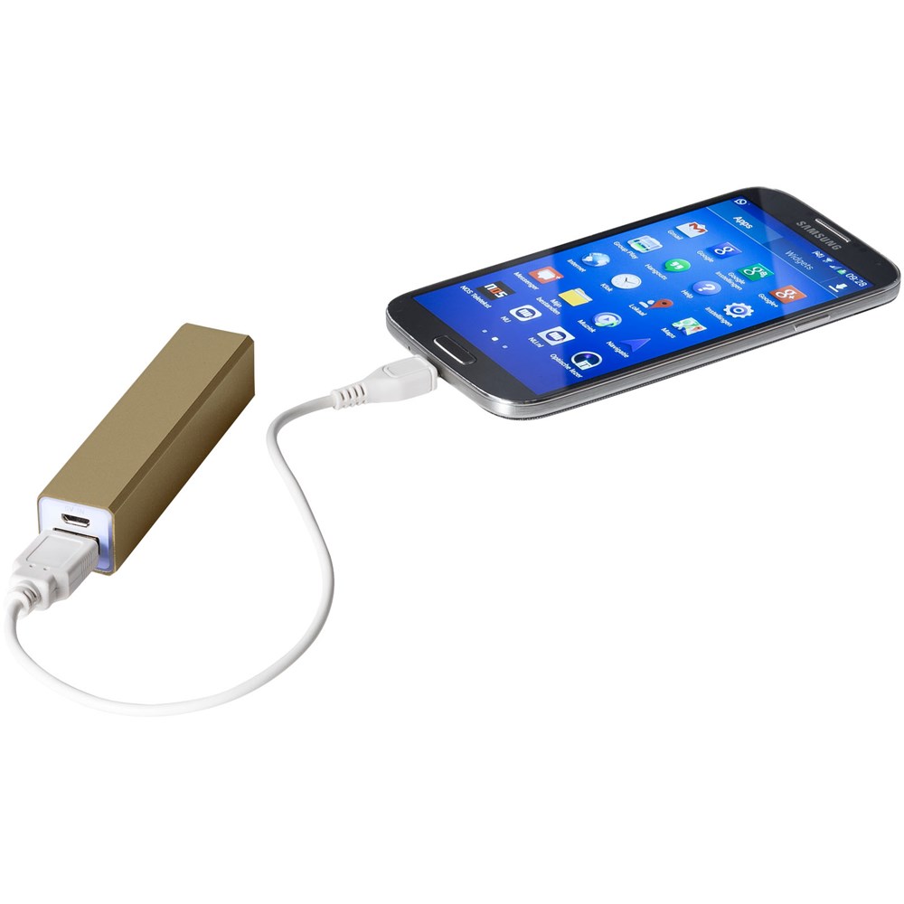 Die 2200 mAh Akkukapazität der Powerbank reicht aus, um ein mobiles Gerät oder Tablet (5V/1A) aufzuladen. Powerbank lädt über mitgeliefertes USB-Kabel und blaue Lichtanzeige schaltet sich ein, wenn sie voll aufgeladen ist. Metalleffektlack. Verpackt in einer weißen Geschenkbox.