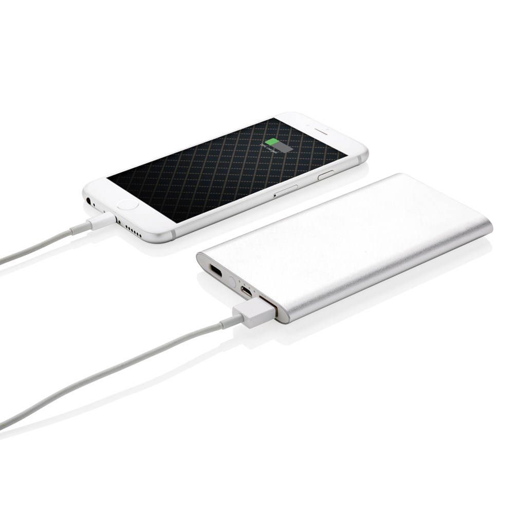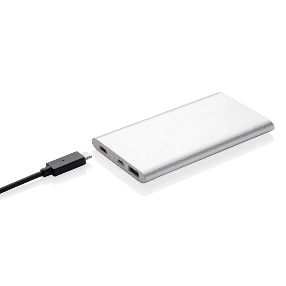 4.000 mAh Powerbank aus eloxiertem Aluminium. Die Powerbank hat sowohl einen USB Ausgang sowie einen 2.0 Typ C Ausgang. Output 5V/2.1A, Input 1A. Inklusive Micro-USB Kabel.