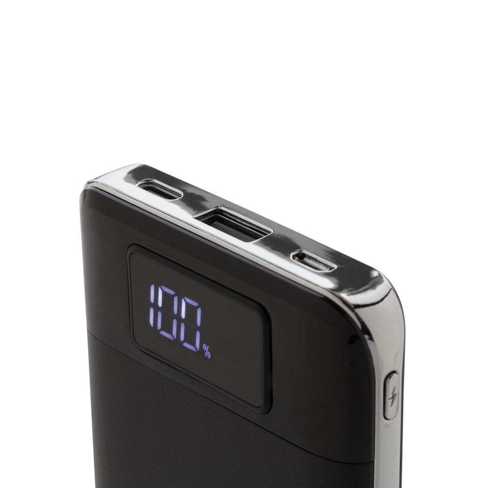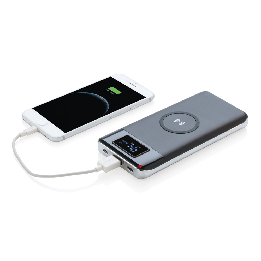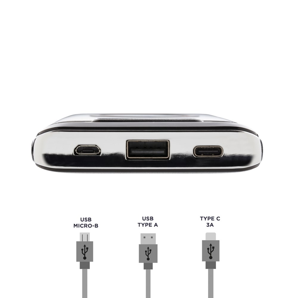 Diese Powerbank vereint alle modernen Technologien in einem Gerät: Type C, Wireless Charging und ein hochqualitatives, digitales Display um die verfügbare Energie anzuzeigen. Die Powerbank hat eine 10.000 mAh Lithium Batterie, welche mit einem Micro USB und einem Type C Port geladen werden kann. In der Mitte der Powerbank befindet sich ein 5W Wireless Charger, der Ihr mobiles Gerät kabellos auflädt. Wireless Charging ist kompatibel mit Android der letzten Generation, iPhone 8 und höher. Input: 5V/ 2.1A. Type C input 5V/3A; Type C output 5V/3A Wireless Output: Output: 5V/1A 5W.