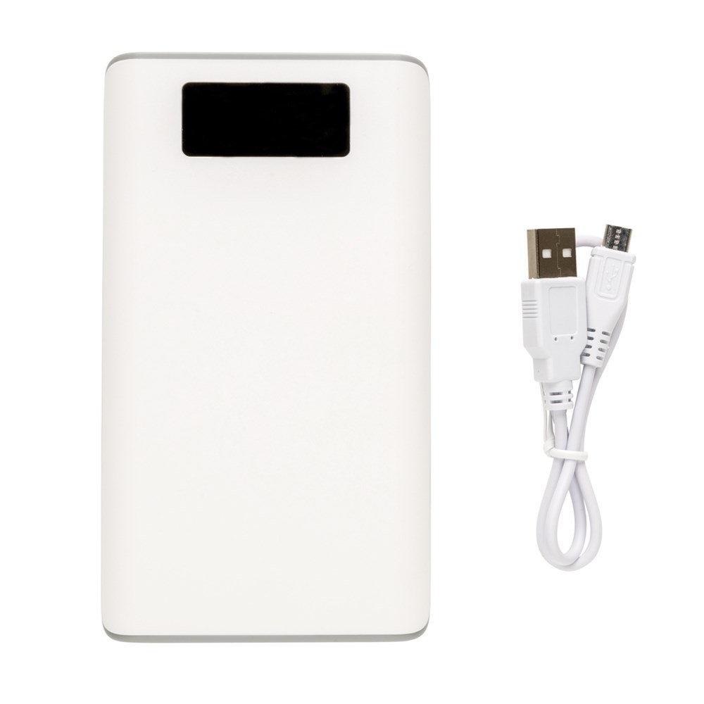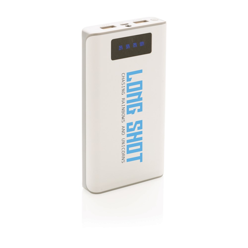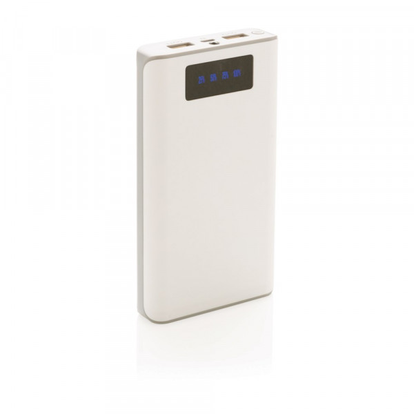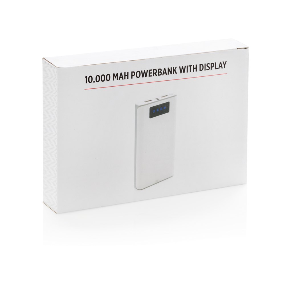 Powerbank mit 10.000 mAh Lithium Batterie und Display, welches den Ladestand anzeigt (25%-50%-75%-100%). Die Powerbank verfügt über 2 Outputs (max. 2.1A), um zwei Geräte zur selben Zeit aufzuladen. Output 5V/2.6mAh, Input 5V/2A. Inklusive Micro-USB Kabel.