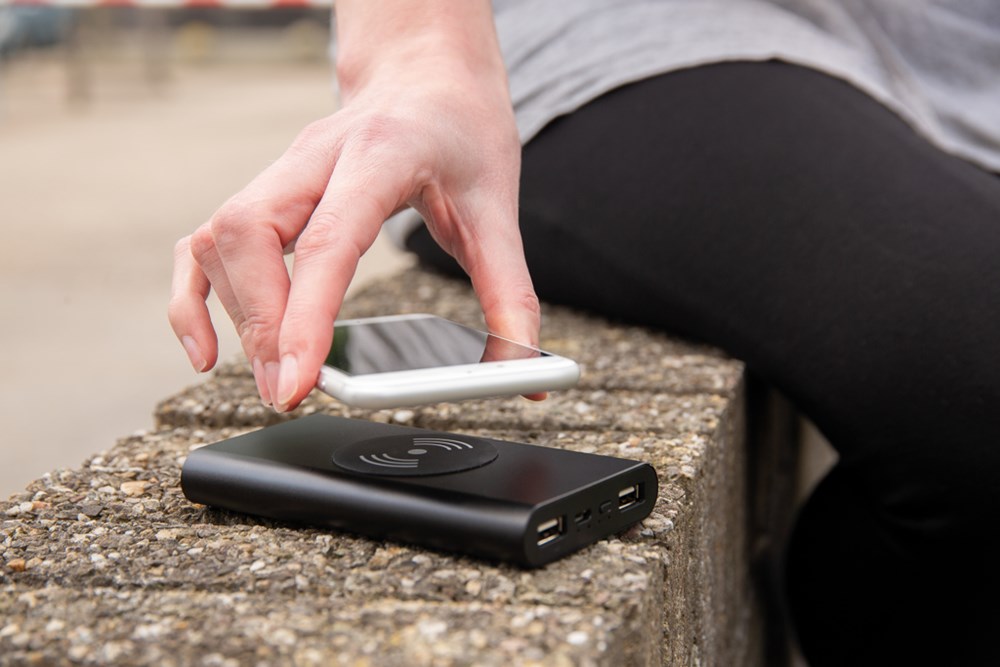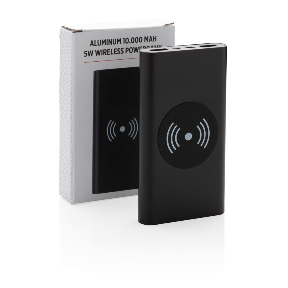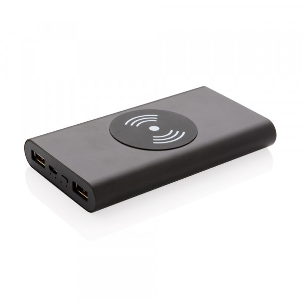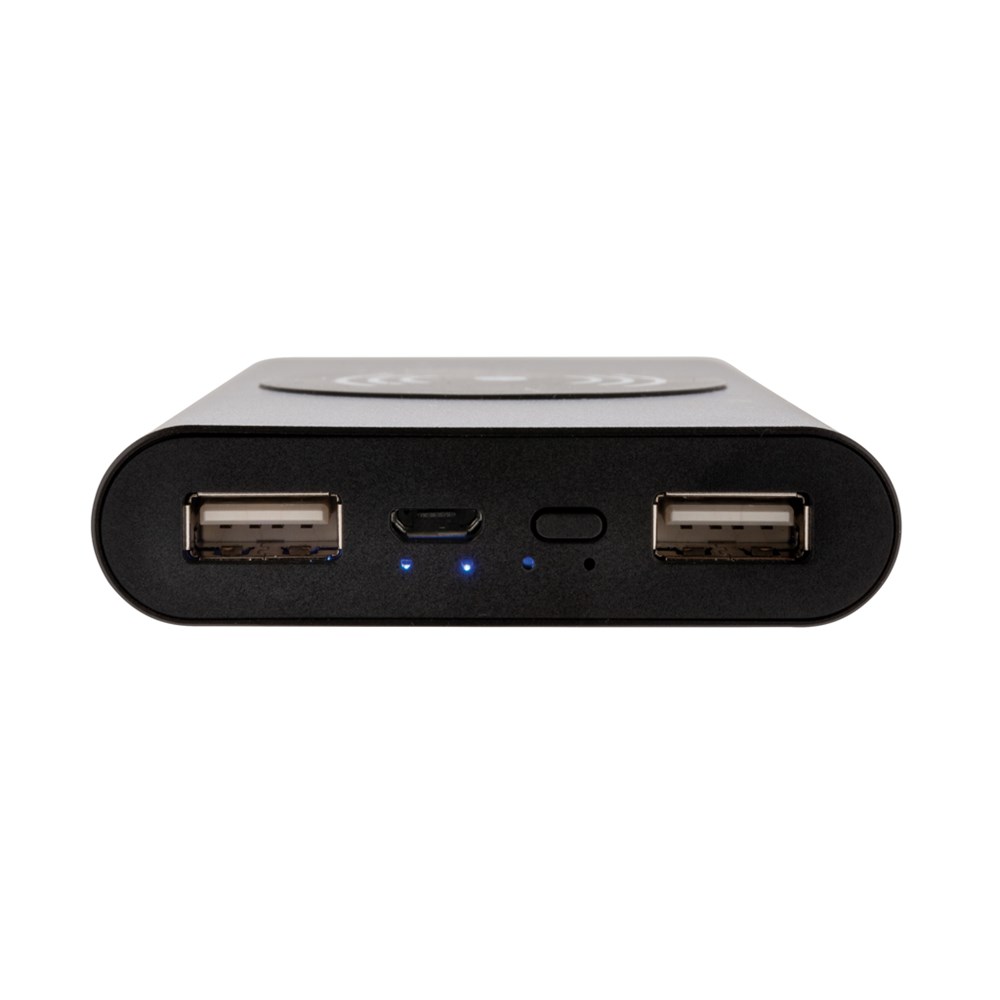 Schicke 10.000 mAh Powerbank aus Aluminium im Taschenformat. Die A-Grade 10.000 mAh Lithium-Polymer Batterie erlaubt es Ihnen bei voller Ladung Ihr Smartphone bis zu 5 mal aufzuladen - über 2 herkömmliche USB-Ports oder über das 5W Wireless Charging Pad. Die LED's zeigen Ihnen den Ladestand der Powerbank an, so dass Sie immer wissen wann es Zeit wird sie wieder zu laden. Micro-USB Port-in: 5V/1.5A Output: 5V/2.1A. Wireless Output 5W 5V/1A.