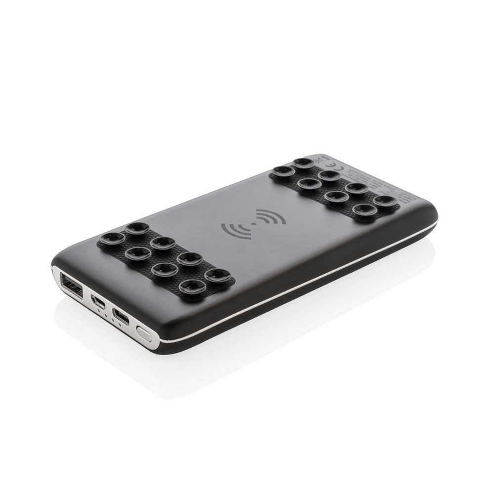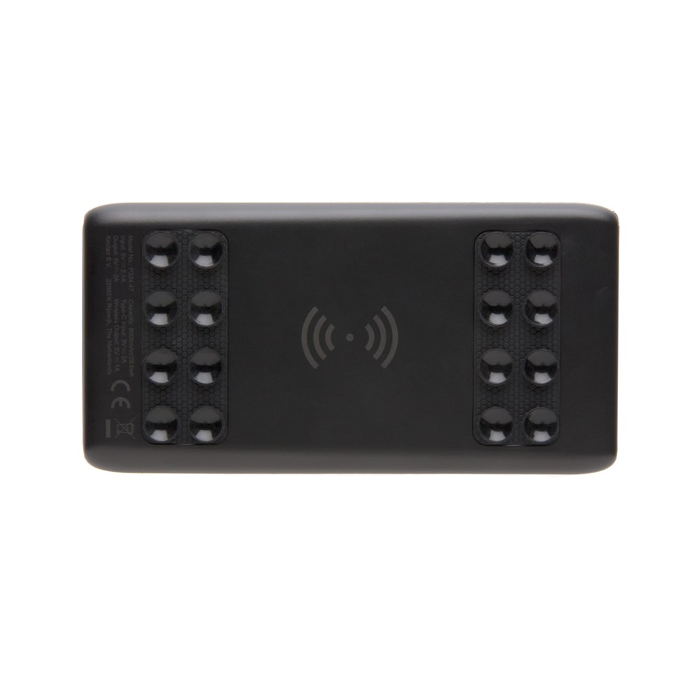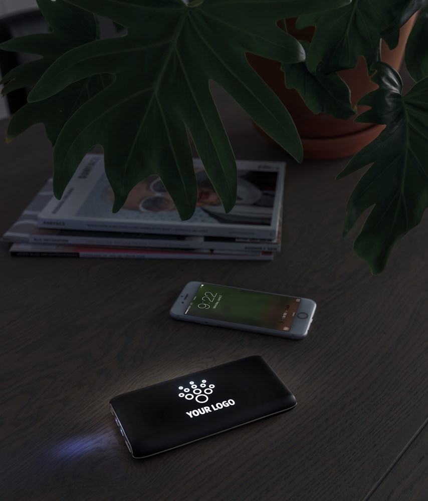 Flache und langlebige Powerbank mit 8.000 mAh Lithium Polymer Batterie. Die wireless ABS Powerbank bringt Ihr Logo perfekt zur Geltung. Veredeln Sie die Powerbank mit einer Gravur auf der Vorderseite und während dem Gebrauch der Powerbank wird das Logo erleuchtet - ein wahrer Blickfang! Auf der Powerbank befinden sich ausserdem noch Saugnäpfe um Ihr mobiles Gerät an Ort und Stelle zu halten. Natürlich können Sie auch alternativ die Powerbank normal mit einem USB Kabel gebrauchen. Output: 5V/2.1A. Input: 5V/2A. Wireless Output: 5V/1A 5W. Registered design®