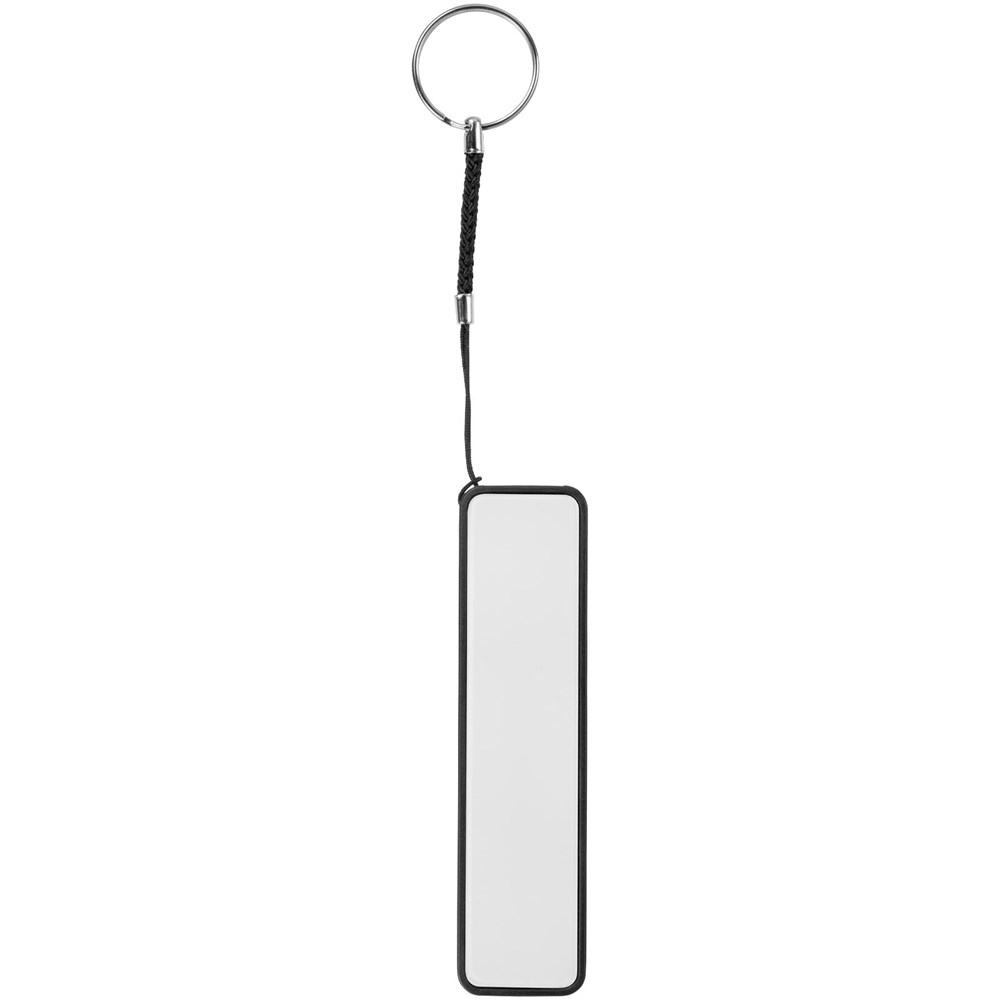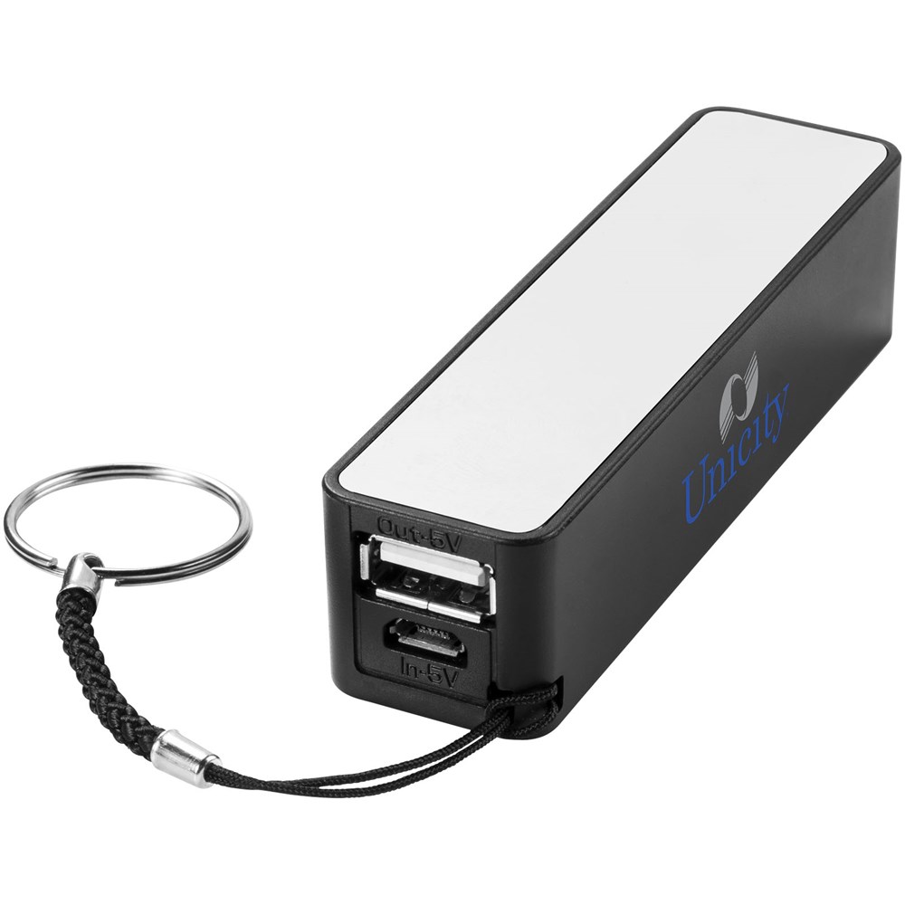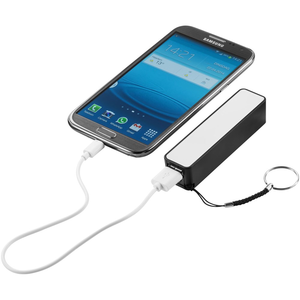 2000 mAh Akkukapazität mit LED Anzeige für den Ladefortschritt. Wiederverwendbare Powerbank lädt Geräte über das mitgelieferte USB-Kabel in ca. 2 Stunden auf. Mit geteiltem Schlüsselring aus Metall und weißem Karton.