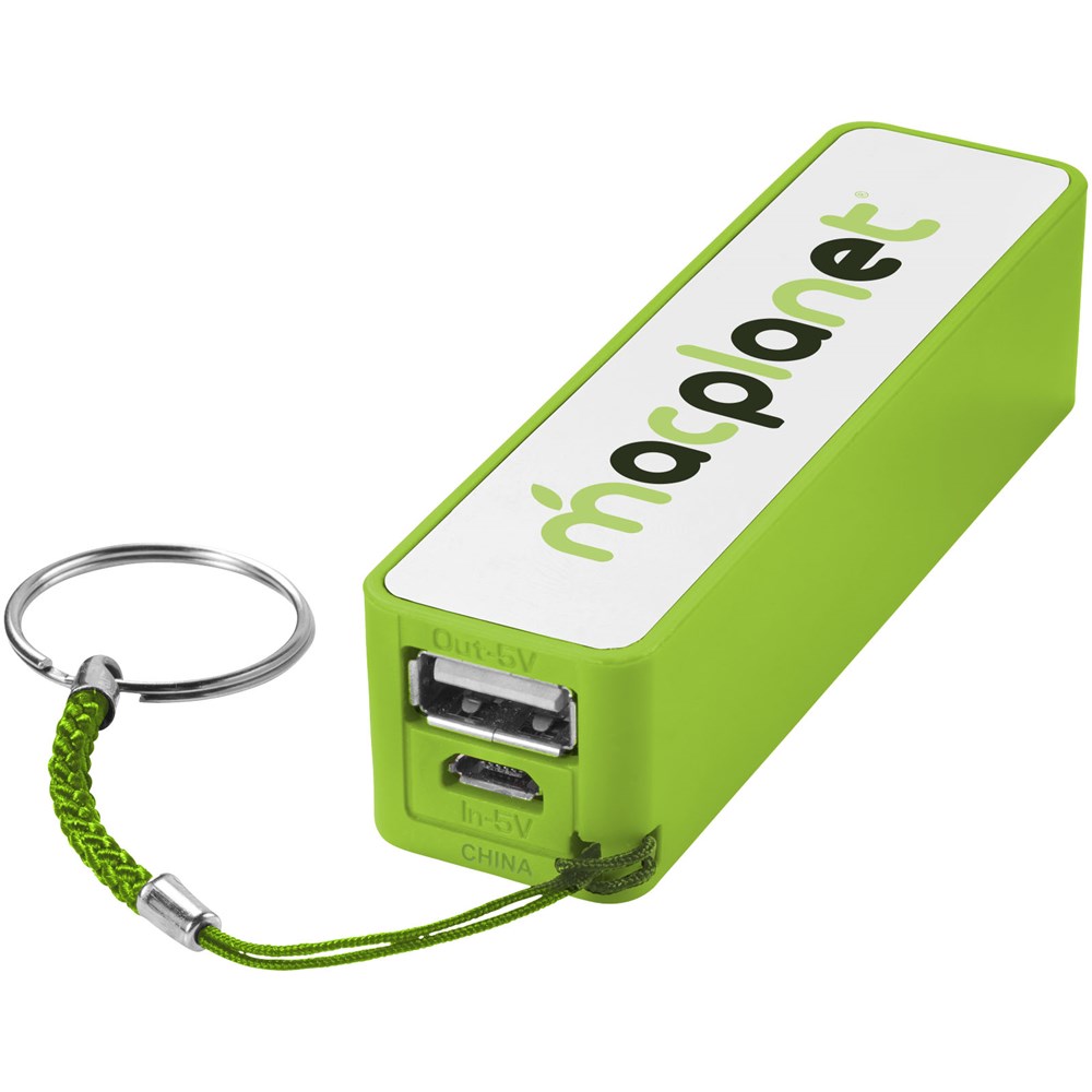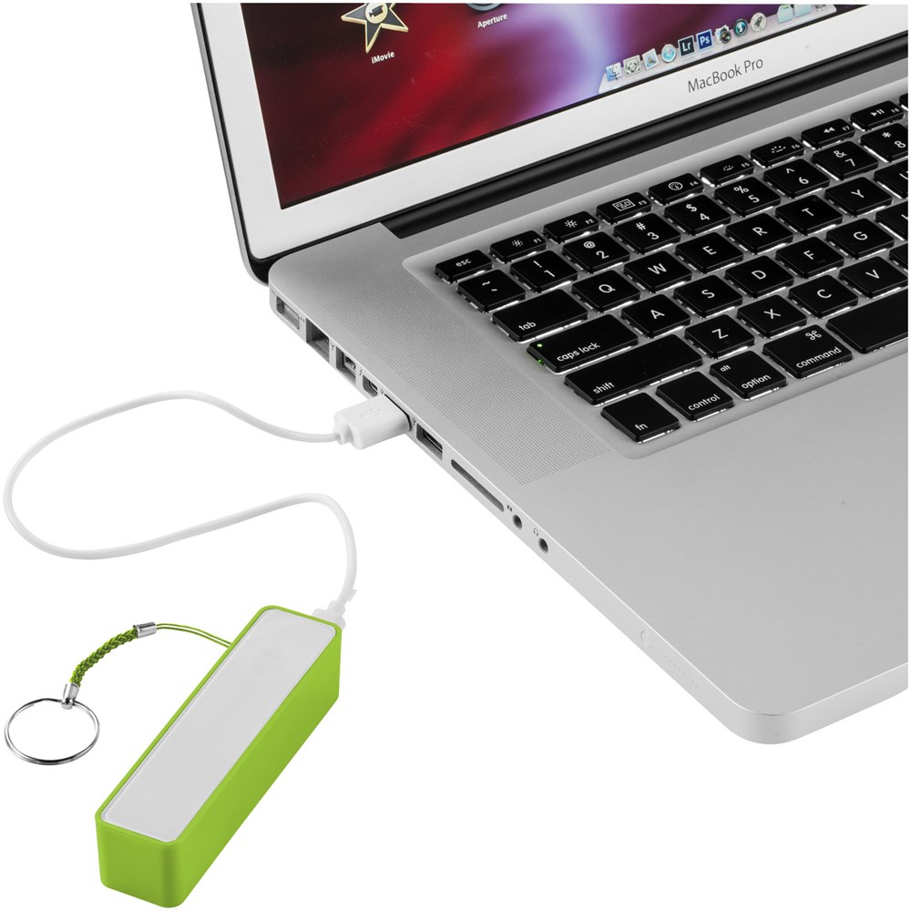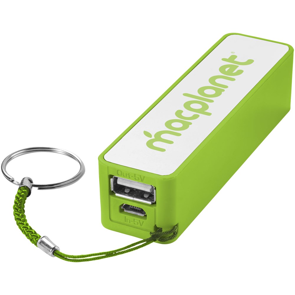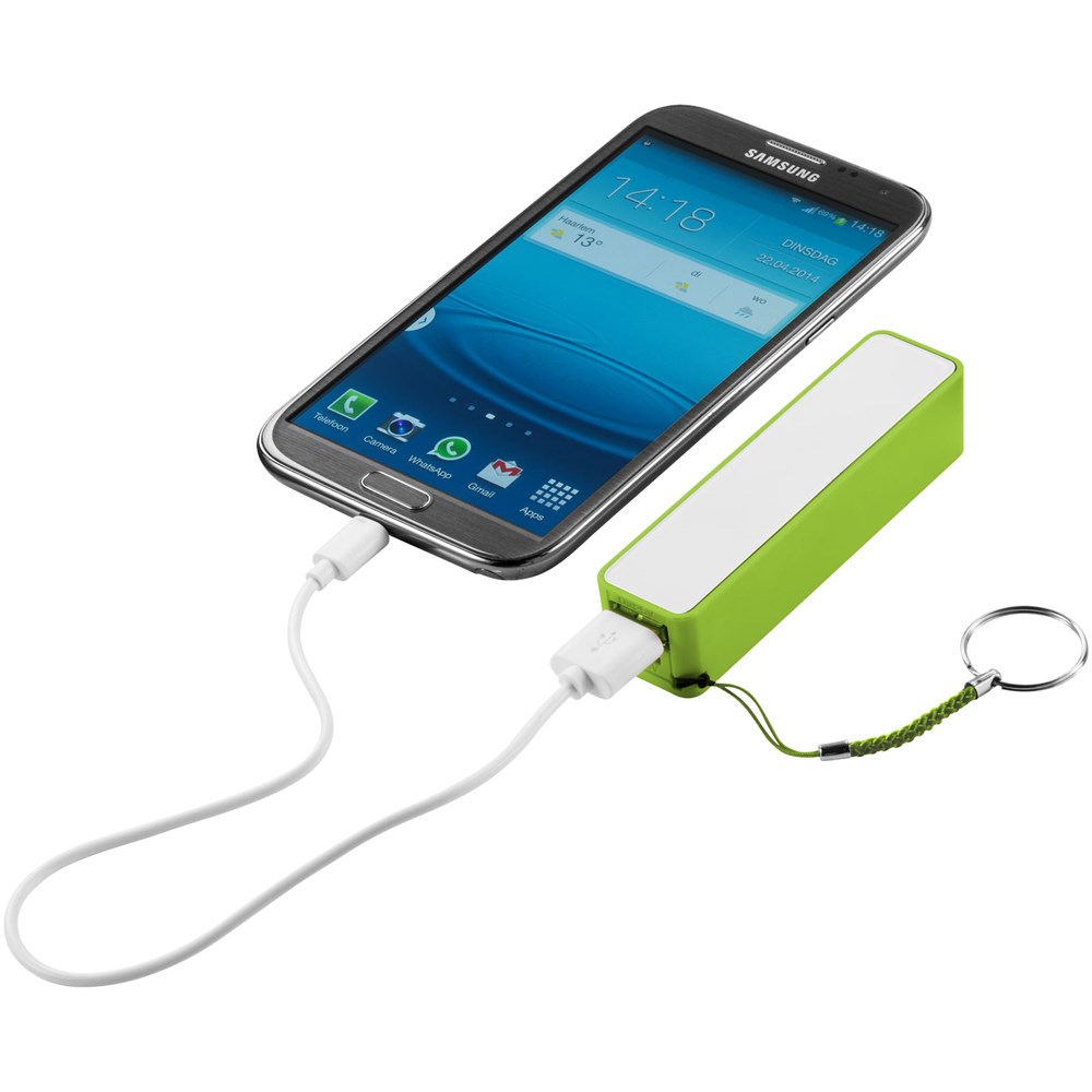 2000 mAh Akkukapazität mit LED Anzeige für den Ladefortschritt. Wiederverwendbare Powerbank lädt Geräte über das mitgelieferte USB-Kabel in ca. 2 Stunden auf. Mit geteiltem Schlüsselring aus Metall und weißem Karton.